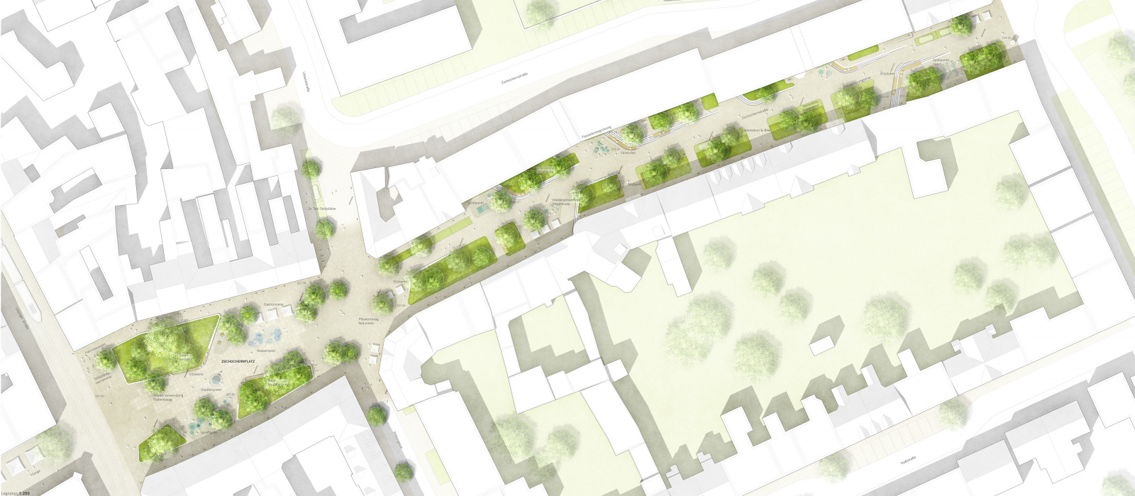 Der Platzbereich ist leicht zurückgesetzt, was einen angemessenen Auftakt in den Stadtraum am Zschochern bildet. Mit der Anordnung der westlichen Klimainseln öffnet sich der Raum zur Sorge, so dass ein zentrierter und klarer Übergang der beiden Stadträume entsteht. Das Konzept eines zentralen, linearen Raumes und die Freihaltung der Bereiche vor den Gebäuden mittels nachvollziehbar angeordneter Grünflächen, wird als gelungen gewertet.