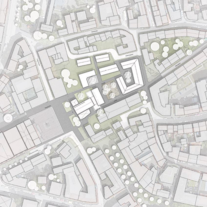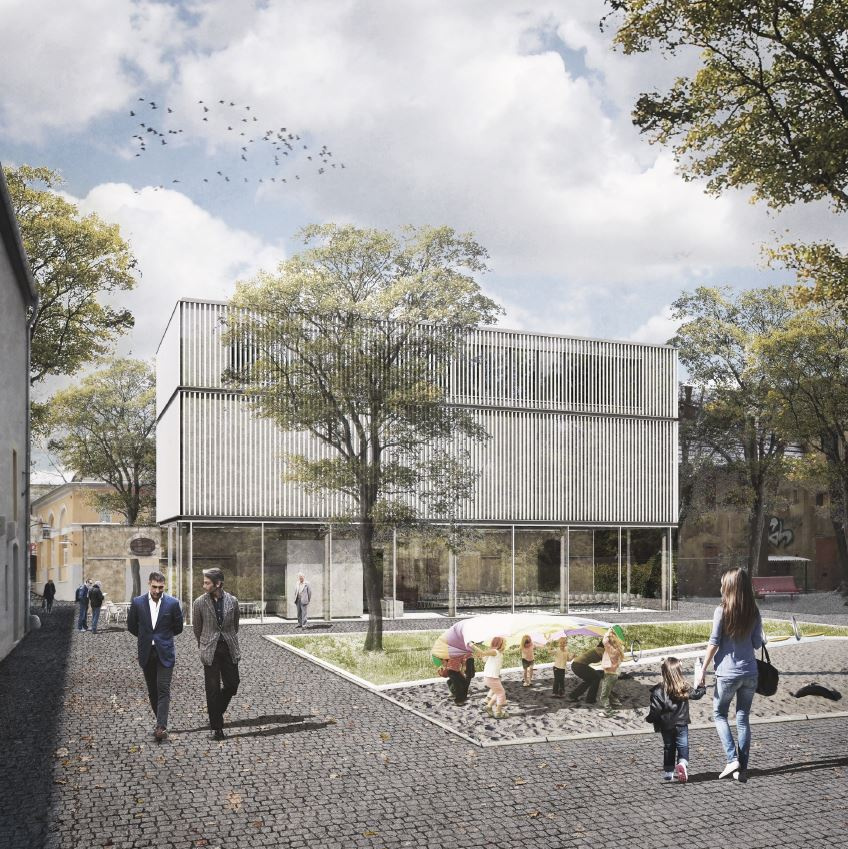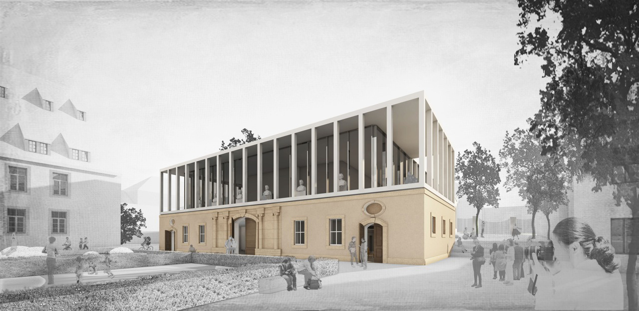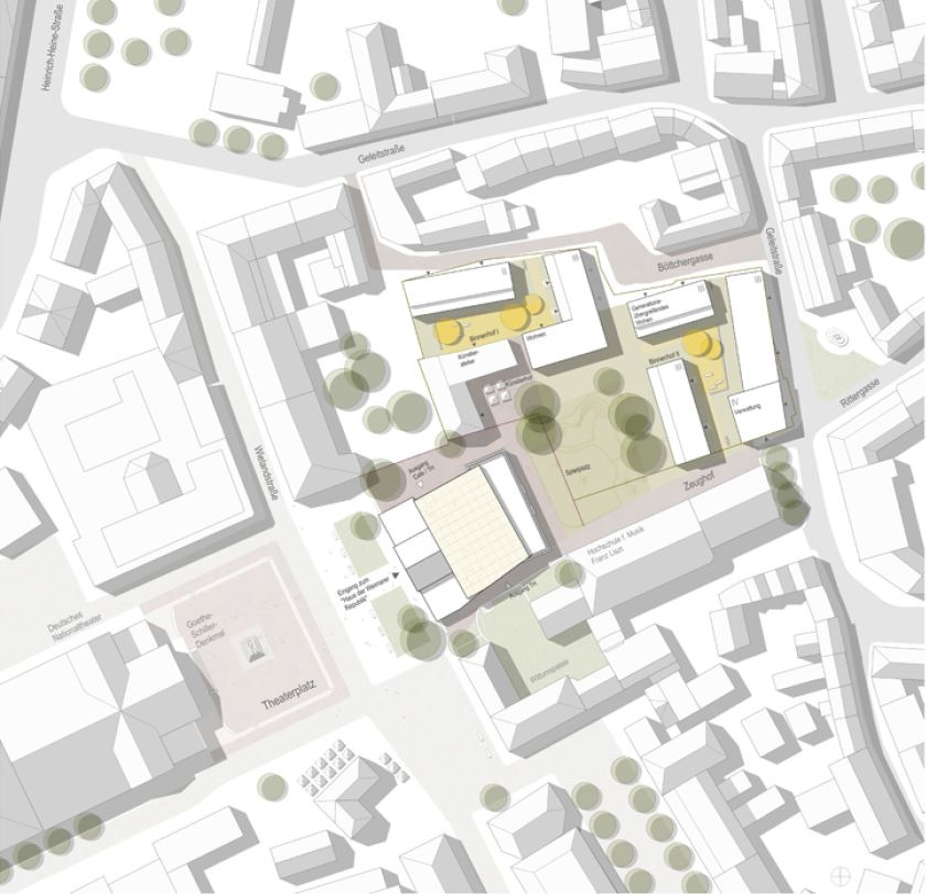 In Richtung Zeughof wird ein, das Ensemble geschickt ergänzender dreigeschossiger Neubau vorgeschlagen, welcher die vorhandenen Rudimente des Zeughauses nicht zu einem die historische Kubatur mehr oder weniger nachempfindenden Volumen komplettiert, sondern diese als Zeitzeugen einer unwiederbringlichen Vergangenheit unverändert erhält und in eine attraktive Abfolge von Innen- und Außenräumen einbindet. Mit dem Volumen des Ergänzungsbaus gelingt es zudem, die durch den Abriss des Zeughauses verloren gegangene Raumfassung des Theaterplatzes wiederherzustellen.