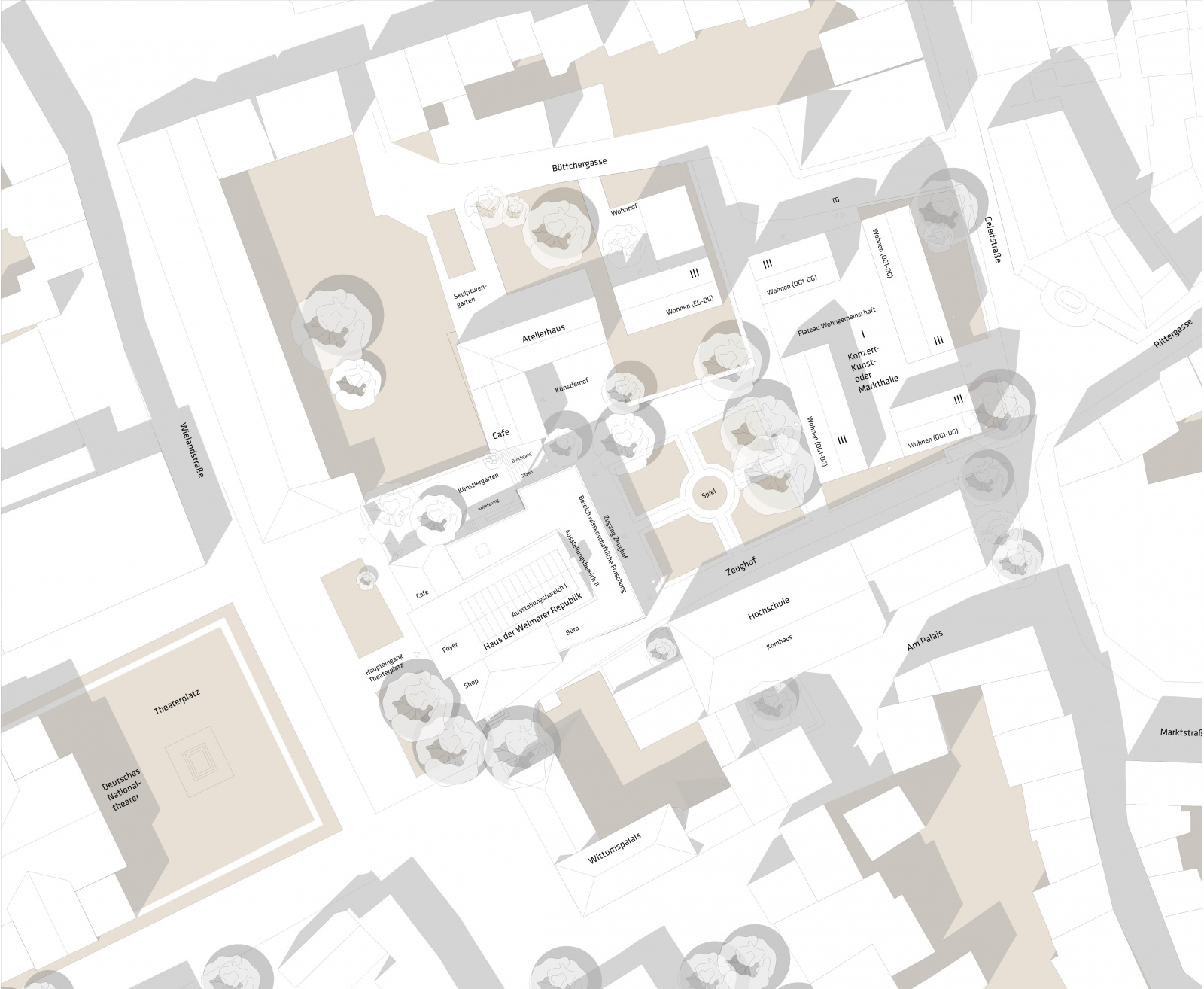 Mit einem sehr disziplinierten Einsatz der Gestaltungsmittel gelingt der Arbeit eine klare, in die angrenzenden Stadträume angemessen einbindende Grunddisposition. Die mittige Eingangssituation zum Theaterplatz mit seitlich angrenzender Garderobe und Museumsshop übernimmt unaufgeregt die vorgefundene Figur. Ebenso bleibt die Baukörperdisposition entlang des südlichen Durchganges zum Zeughof unverändert beibehalten. Ein komplementär hierzu neu hinzugefügter Erschließungsweg entlang der ebenfalls unveränderten Nordfassade schafft die gewünschte Erhöhung der Durchlässigkeit zwischen Theaterplatz und Zeughof. Die damit verbundene Option einer inhaltlichen, Verweilqualitäten schaffenden, Bespielung des nördlichen Vorplatzes wird leider nicht genutzt.