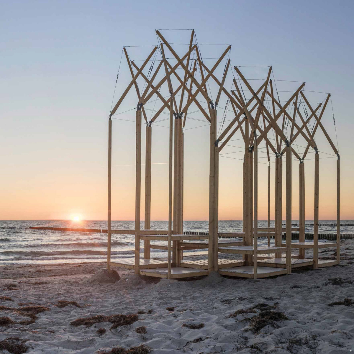 Zurück in Weimar wurde eine Struktur entwickelt, die ihre kulturelle Wurzel in der Bauform nicht leugnet und zugleich offen ist für unterschiedliche musische Nutzungen auf der Insel. Die lebendige Trag-Struktur (Tensegrity) folgt den Regeln der sie umgebenden Natur und stellt zugleich ein offenes Gewölbe aus Linien dar, das dem luftigen Bauwerk eine geometrische Würde verleiht.