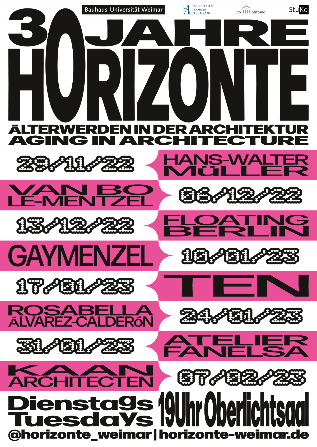 Zum 30-jährigen Jubiläum von horizonte behandeln die Vorträge im Wintersemester 2022/23 das Thema „Älterwerden in der Architektur“. Wie geht man mit dem Thema des Älterwerdens im architektonischen Kontext um und wie gestaltet sich die Beziehung zwischen Architektur und ihrer Praxis im Laufe der Zeit?