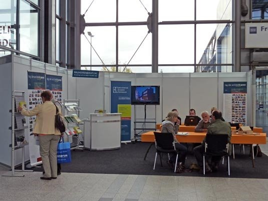 Wie bereits 2008 präsentierte die Architektenkammer Thüringen auch auf der diesjährigen Baufachmesse „Haus+Technik“ die Ausstellungstafeln vom tag der architektouren. Neu jedoch war der eigene Messestand an zentraler Stelle auf der gegenüberliegenden Seite des Foyers. Auf insgesamt 36 Quadratmetern erhielten Besucher vom 11. bis 13. September nicht nur ausführliches Anschauungs- und Informationsmaterial zu aktueller und ausgezeichneter Architektur aus Thüringen, sondern auch zum Leistungsspektrum der Architekten sowie Tipps und Tricks zu Hausbau, Umbau und Sanierung.