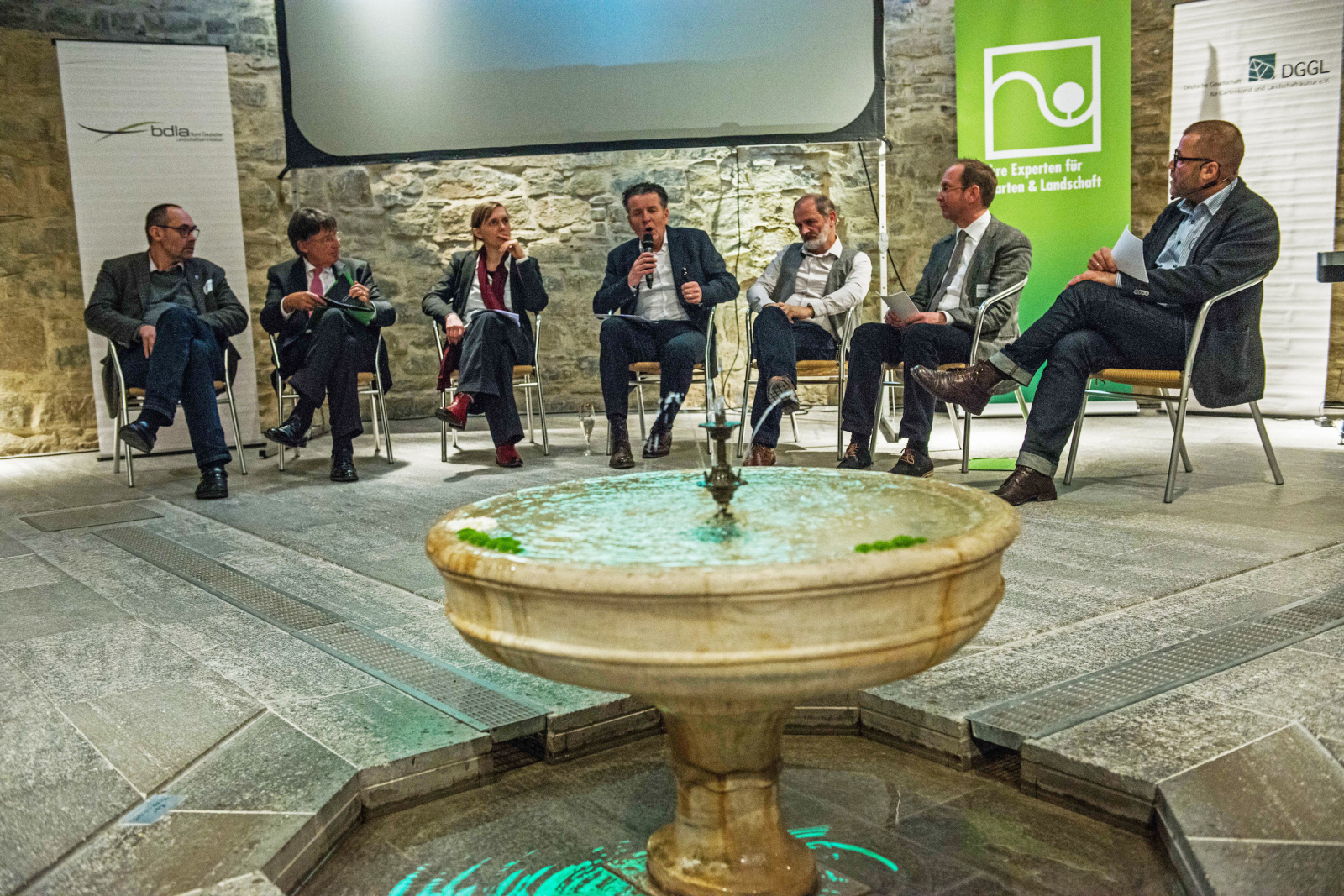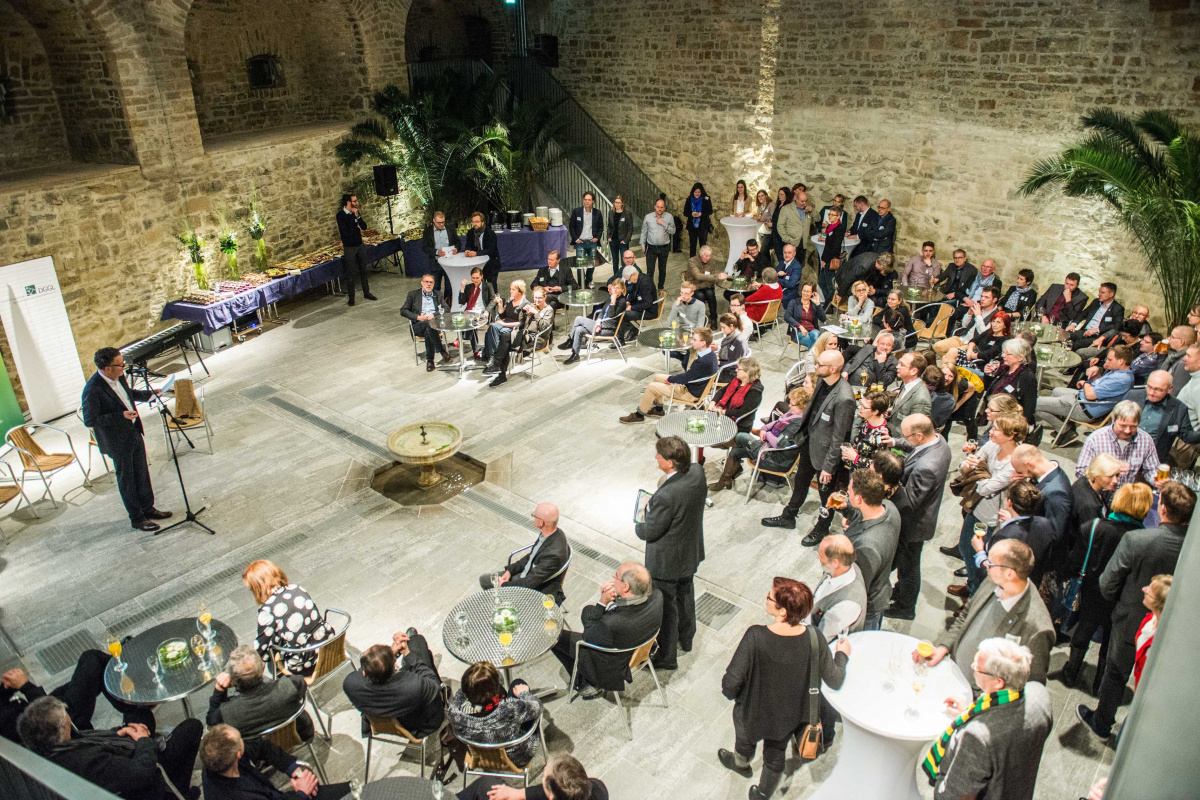 Die Landesverbände von bdla, DGGL und FGL hatten wieder in den Kanonenhof im Deutschen Gartenbaumuseum geladen, und rund 150 Menschen folgten der Offerte. Wie schon in den vergangenen Jahren wurde der Empfang von der Baumschule Lorberg, Rinn Beton- und Natursteine sowie der Leipziger Leuchten GmbH finanziell unterstützt.