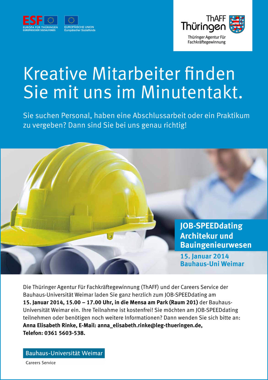 Die Thüringer Agentur Für Fachkräftegewinnung (ThAFF) und der Careers Service der Bauhaus-Universität Weimar laden herzlich zum Job-Speed-Dating am 15. Januar 2014, von 15:00 bis 17:00 Uhr, in die Mensa am Park (Raum 201) der Bauhaus-Universität Weimar ein.