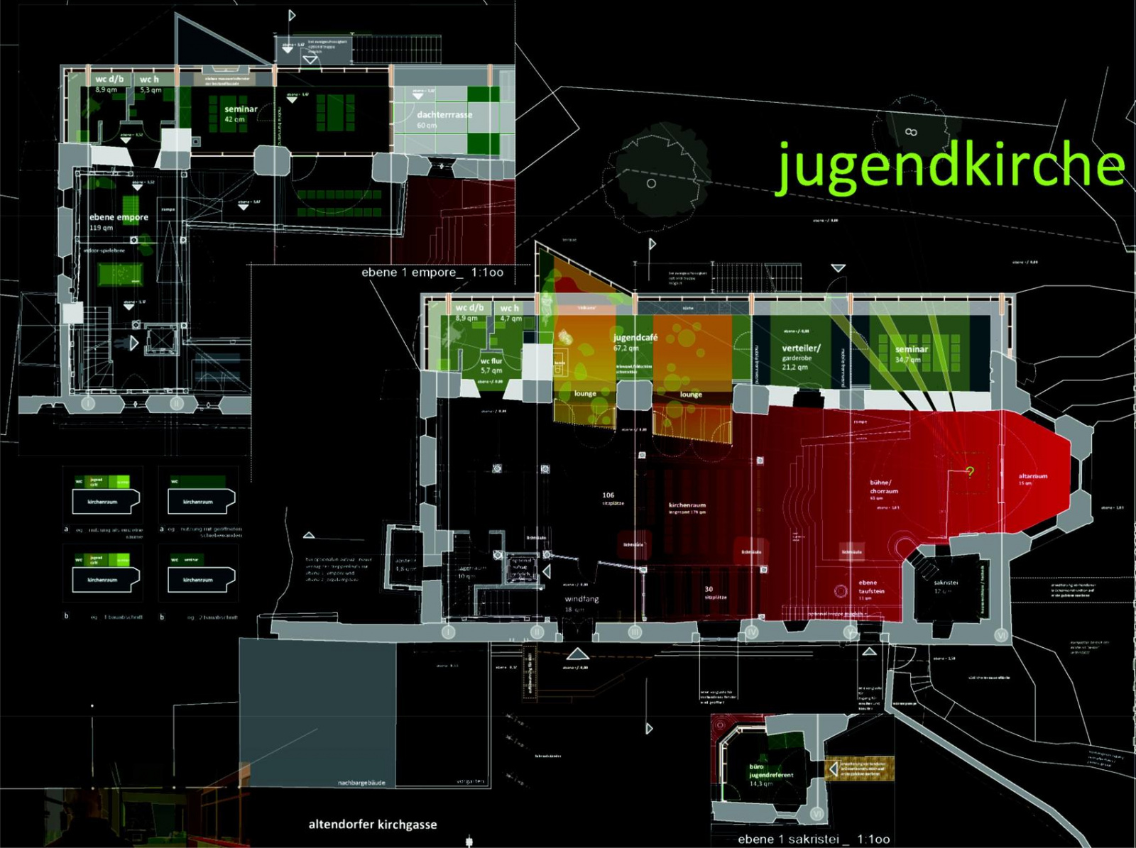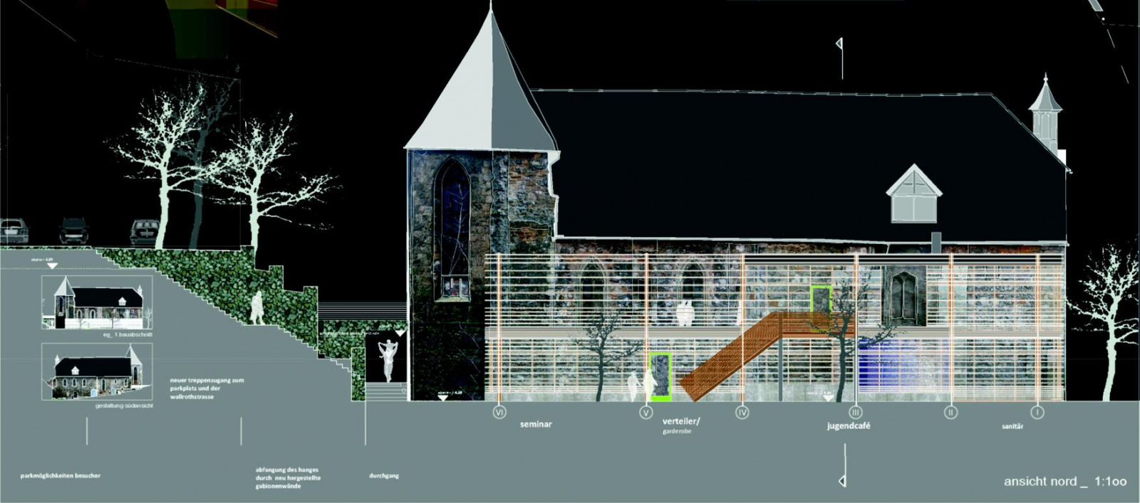 Das Entwurfskonzept zur Jugendkirche zeigt eine klare Struktur der Raumfolge und Erschließung. Dabei wird das in der Aufgabenstellung geforderte Raumprogramm überzeugend in einer Ebene im Erdgeschoss barrierefrei verwirklicht. Die Idee, das Jugendcafe zum städtischen Vorplatz zu öffnen, wird von der Jury und den Beratern begrüßt. So heißt die Jugendkirche mit dem Jugendcafe auf dem öffentlichen Platz vor der Kirche alle willkommen. Im Westbereich der Südfassade erfolgt der Einbruch eines zusätzlichen Eingangs (…). Die Lage dieses Haupteinganges ermöglicht über einen unter der Westempore angeordneten Durchgang die Erschließung der Kirche und des im Nordbereich angeordneten kompakten Anbaus. An dem Durchgang (…) anschließend sind Garderobe, neues Treppenhaus zur ersten Empore und das Büro des Jugendreferenten angeordnet. Im Anbau sind neben zwei durch eine mobile Trennwand abgeschlossenen Seminarräumen die Toiletten und ein kleiner Lagerraum angeordnet. Zwischen Anbau und Kirchenschiff-Nordwand ist ein Durchgang mit Glasdach eingefügt. Diese Lichtfuge zwischen Anbau und Kirche sorgt für eine gestalterische Trennung zwischen Neubau und historischem Gebäude. Seminarräume und Kirchenschiff können gleichzeitig genutzt werden. Die Emporen werden erhalten und im Chorraum sind nur geringfügige Veränderungen vorgesehen, so dass der Gesamtraumeindruck der Kirche erlebbar bleibt. Der ausgesprochen behutsame Umgang mit dem Denkmal wird positiv bewertet. Dieses Konzept ermöglicht auch eine multifunktionale Nutzung, z. B. könnten Kreissynoden und andere Veranstaltungen stattfinden. Insgesamt überzeugt der Entwurf durch seine klare architektonische Sprache und die effiziente funktionale Raumaufteilung.