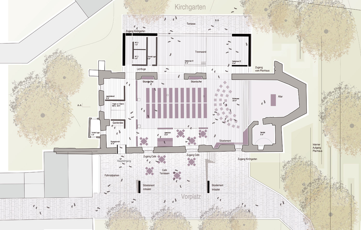 Im Rahmen des Wettbewerbs war der städtebauliche Kontext zu beachten und eine qualitätsvolle architektonische Leitidee zu entwickeln. Vor dem Hintergrund des hohen gestalterischen und multifunktionalen Anspruches galt es, die vorhandenen Baustrukturen behutsam neu zu gestalten sowie optimal als Hülle für lebendige Jugendarbeit auszurichten. Der öffentliche Platz vor der Kirche sollte flexibel in die Nutzung einbezogen werden können.