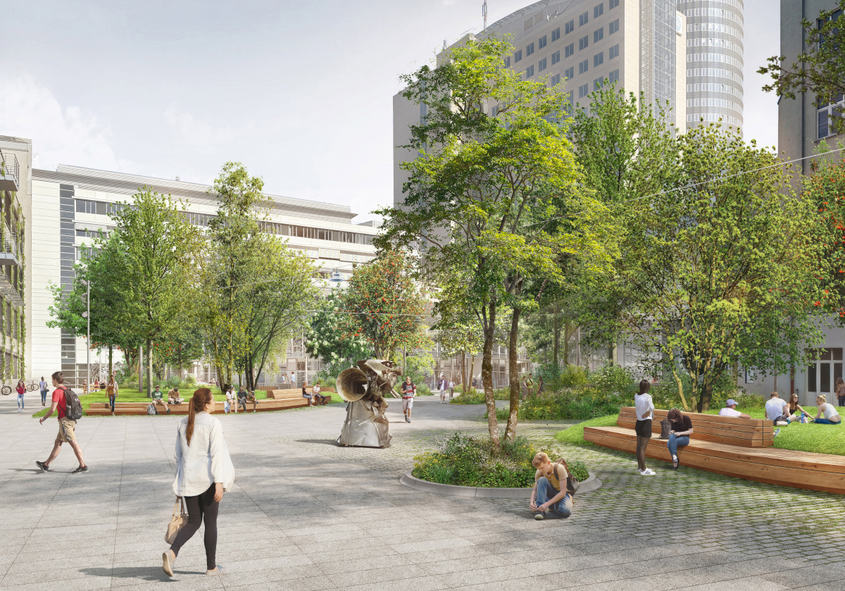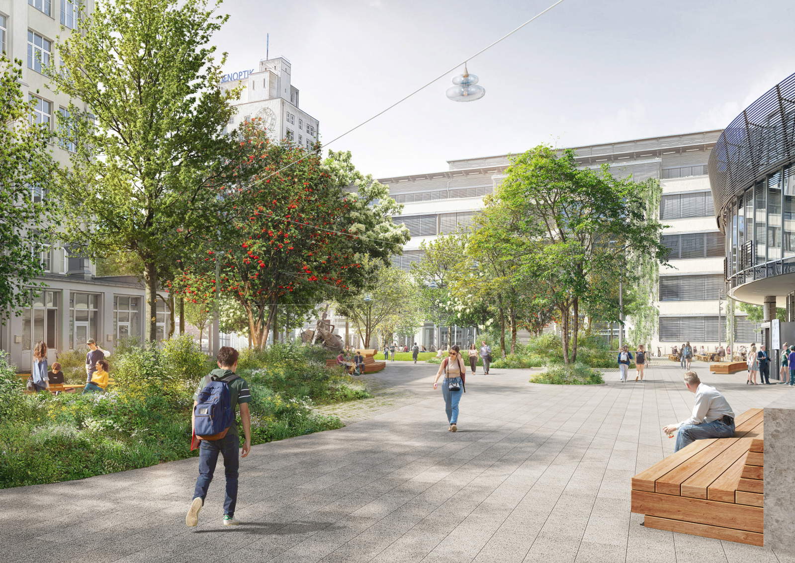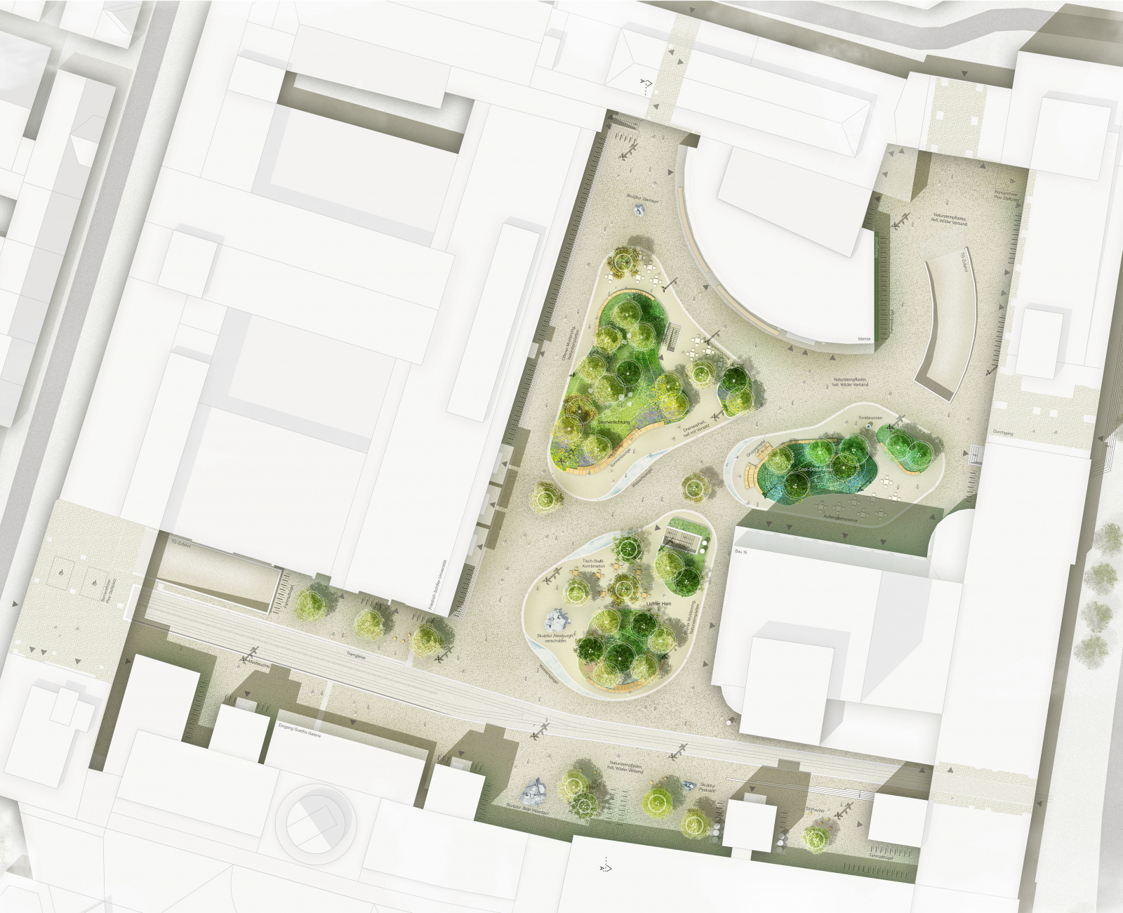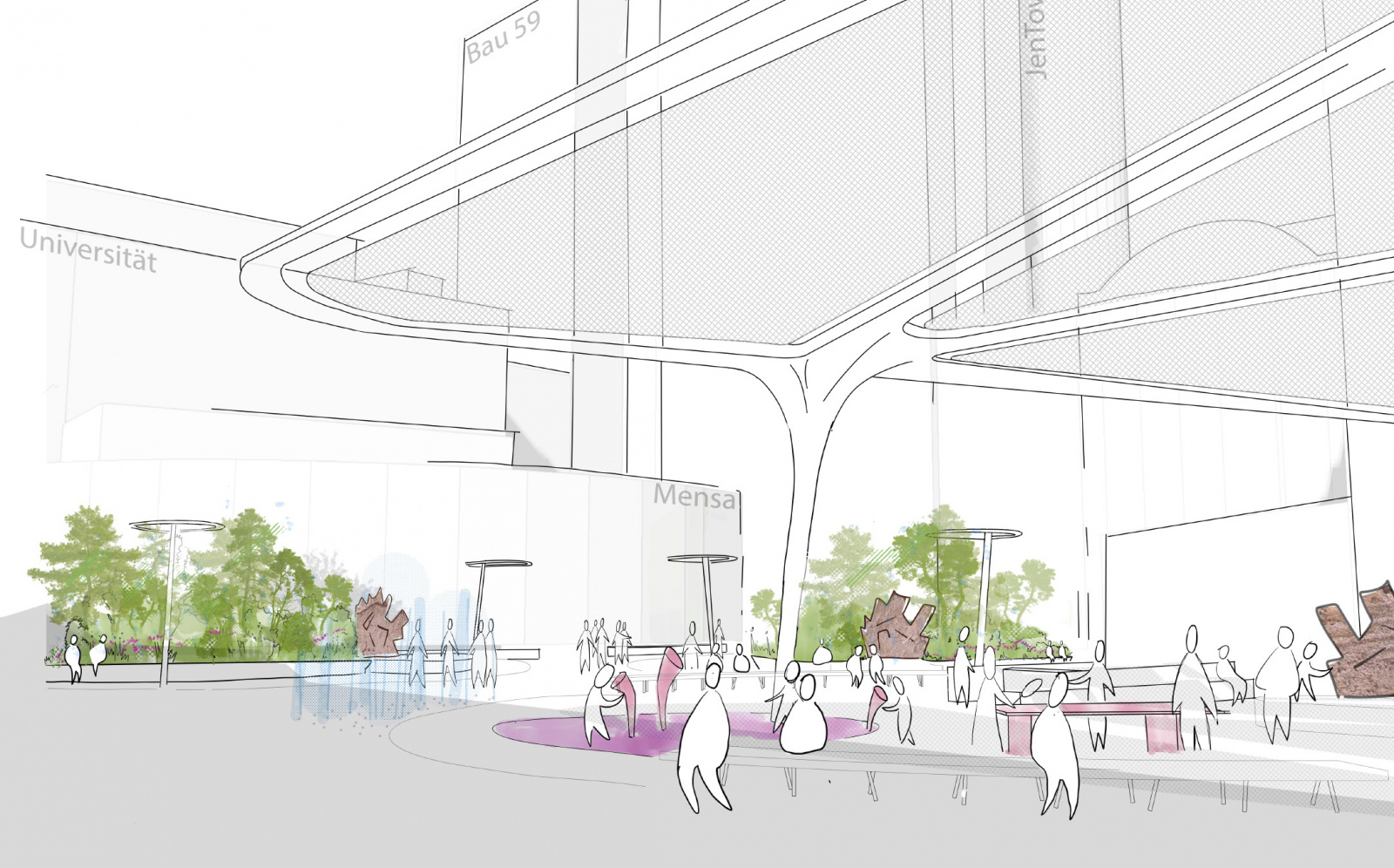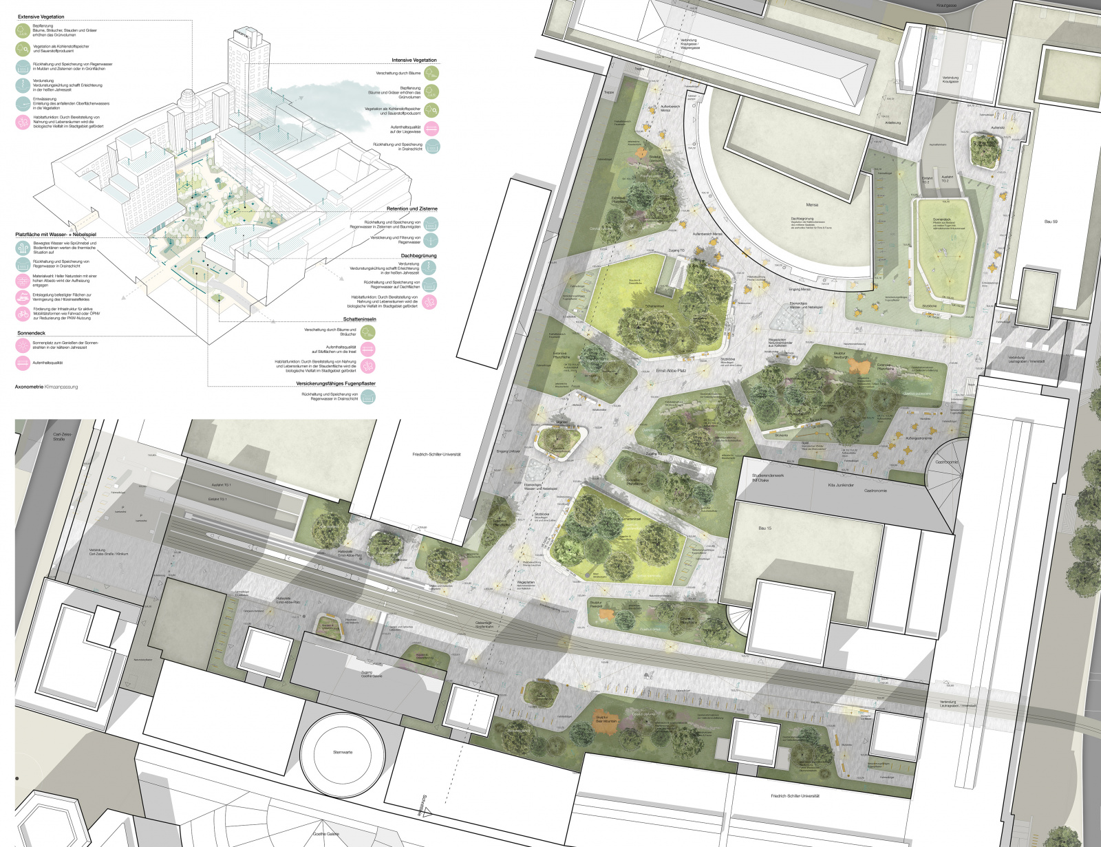 Die Arbeit gliedert den Raum in grüne Inseln und schafft durchdachte räumliche Setzungen und eine gelungene Raumfolge. Der gesamte zur Verfügung stehende Raum wird effizient genutzt. Die Platzbildungen und Durchwegungen sind an den richtigen Stellen positioniert und sorgen für eine gute Orientierung. Die Gruppierung der Inseln in drei Clustern trägt zu einer klaren Übersichtlichkeit bei. Der hohe Grünanteil gibt eine überzeugende Antwort auf die Frage nach klimawirksamen Maßnahmen an einem besonders schwierigen Standort. Die Größe der grünen Inseln ist maßstäblich und das Verhältnis zwischen befestigten Bewegungsflächen und entsiegelten Grünflächen ausgewogen. Das Potenzial einer Entsiegelung und Begrünung wird durch die Verwendung von versickerungsfähigem Grünfugenpflaster in Randbereichen mit geringerem Nutzungsdruck und großzügig begrünten Fassadenflächen gut ausgeschöpft. Es wird ein nuancierter Umgang mit den Grünflächen verfolgt. So entstehen sowohl nutzbare Rasenflächen, die in einer Campusumgebung zum spontanen Aufenthalt im Grünen und im Schatten einladen, als auch baumüberstandene Staudenflächen. Durch die Aufhöhung der Inseln wird eine Substratstärke von etwa 1 m über der Tiefgaragendecke erreicht. Dies bietet sowohl ausreichend Wurzelraum und erscheint auch aus statischen Gründen möglich. Das Konzept des Regenwassermanagements funktioniert in seinen Grundzügen, ignoriert jedoch das Gefälle des Tiefgaragendaches. Weitere wasserbezogene Kühleffekte wie z.B. durch Vernebelung werden vermisst. Die Anordnung der Inseln in größeren durch teilversiegelten Flächen verbundenen Clustern schafft eine zusätzliche Differenzierung der Räume und bildet eine klare Trennung von Innen- und Außenbereichen. Das Angebot an Sitzmöglichkeiten ist gut, könnte jedoch noch etwas vielfältiger gestaltet werden. Die Rahmung aus Grünfugenpflaster verhindert, dass zumindest ein Teil der Sitzgelegenheiten barrierefrei erreicht werden können. Der großzügige Freisitz vor der Mensa wird positiv hervorgehoben und bietet ein gutes Angebot für Studierende und andere Besuchende im Freien zu essen, zu studieren und zu diskutieren. Das Beleuchtungskonzept mit den Seilspannlampen ist stadträumlich interessant, könnte aber zu Konflikten mit den Baumkronen und zu eigentumsrechtlichen Konflikten in der Umsetzung führen. Die Platzierung einer der Stella-Skulpturen vor dem Haupteingang wird kritisch gesehen. Die Anordnung der Fahrradstellplätze ist bezogen auf die Nutzungsströme nicht optimal. Ein größeres Angebot in der Nähe des Hauptgebäudes der Universität wäre sinnvoller als in der südöstlichen Ecke, wo eine hohe Nutzung nicht zu erwarten ist. Der freie Platz für universitäre Veranstaltungen vor dem Haupteingang ist gut platziert. Kontrovers diskutiert wurde, ob der Raum in Bezug auf zukünftige Bedarfe etwas zu eng bemessen ist. Die Erreichbarkeit für Rettungs- und Lieferfahrzeuge scheint mit wenigen Einschränkungen gewährleistet zu sein. Insgesamt liefert der Entwurf eine sehr gute und tragfähige Antwort auf die Frage, wie ein besonders schwieriger Stadtraum klimatisch, räumlich und gestalterisch aufgewertet werden kann.