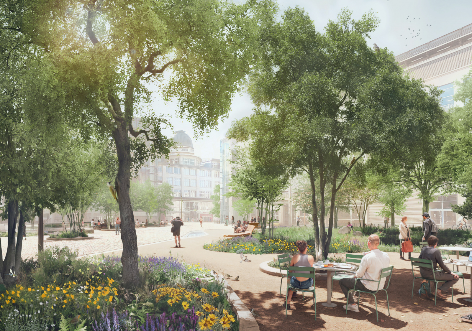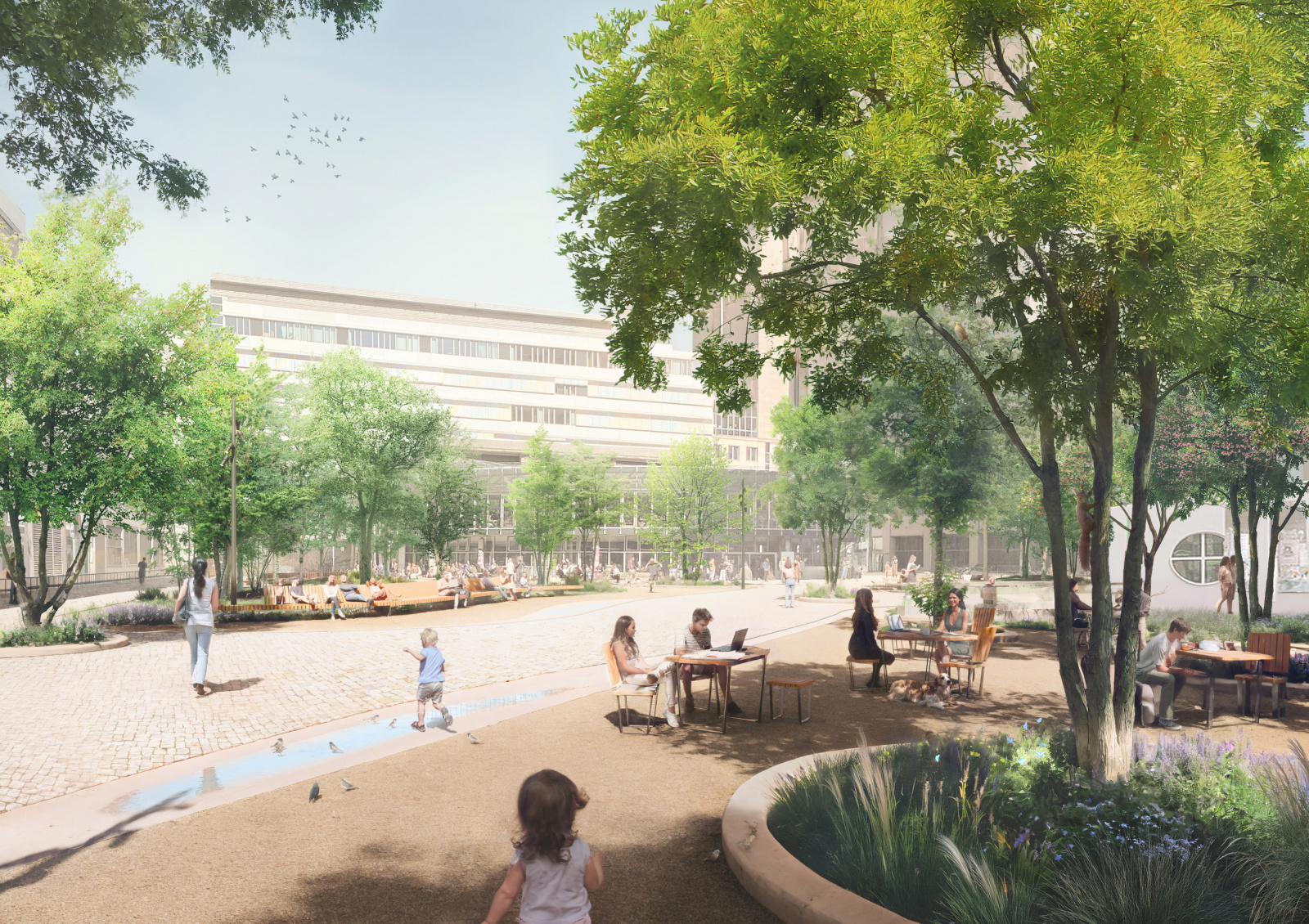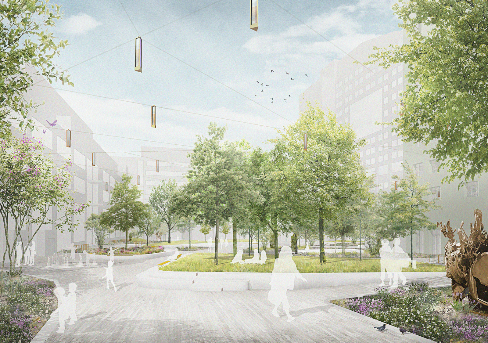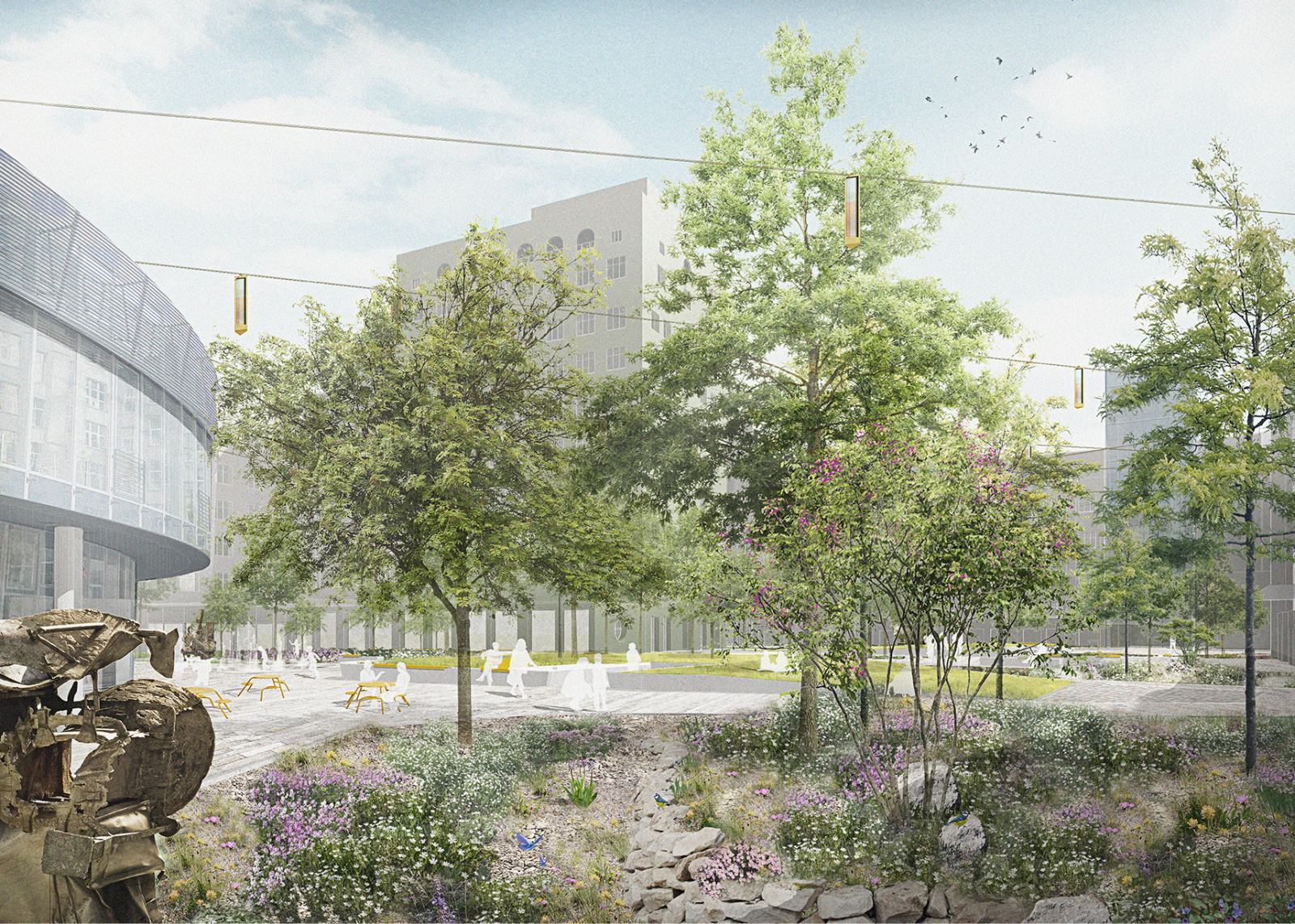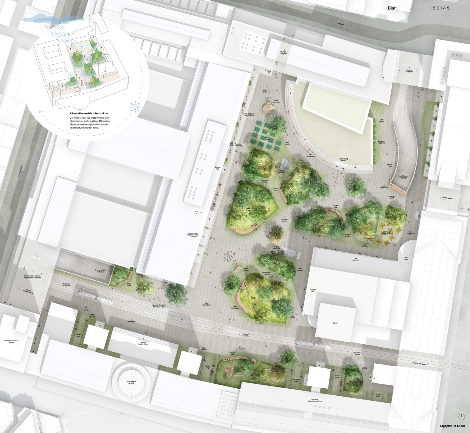 Der mit dem ersten Preis ausgezeichnete Entwurf von Atelier Loidl gliedert den Raum in grüne Inseln und schafft durchdachte räumliche Setzungen und eine gelungene Raumfolge. Die Jury lobte die Arbeit als „eine sehr gute und tragfähige Antwort auf die Frage, wie ein besonders schwieriger Stadtraum sowohl klimatisch als auch gestalterisch und räumlich aufgewertet werden kann“.