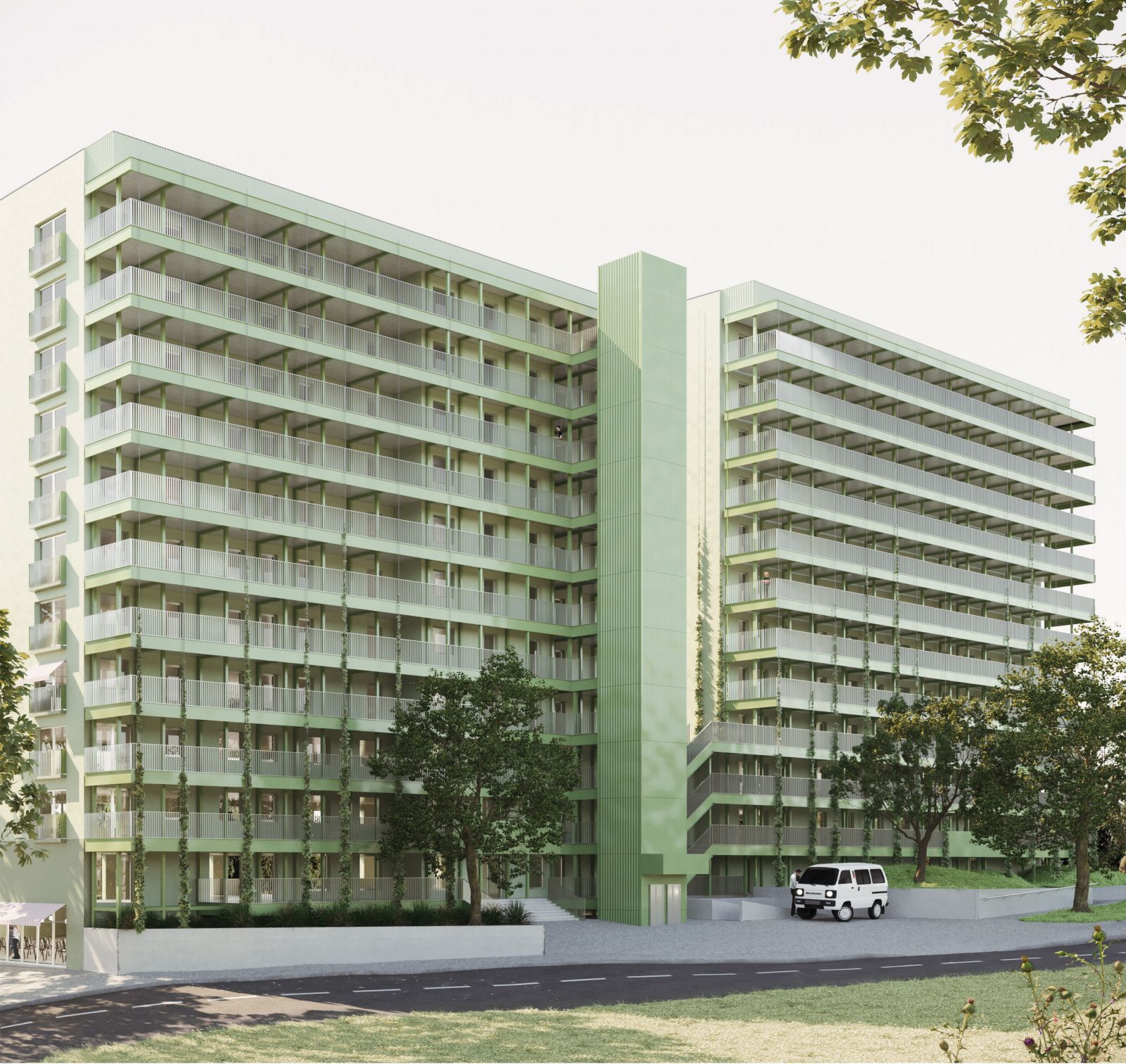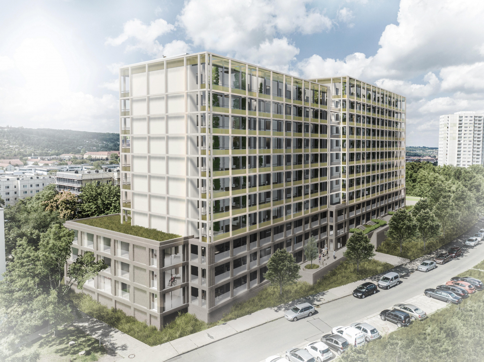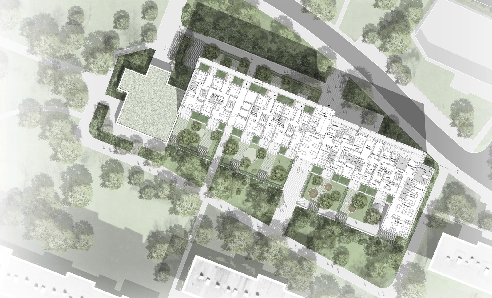 Die Verfassenden schlagen vor, die entfallene Gebäudeachse des Einschnittes durch einen Anbau über die gesamte Höhe an der Ostseite zu kompensieren und im gleichen Duktus weiterzuführen. Dadurch entstehen gut proportionierte Baukörper und neue Räume für die AWO sowie ein zweigeschossiger Quartierstreff. Die städtebauliche Klarheit wird durch die Jury einerseits begrüßt, andererseits die entstehende Enge zu den benachbarten Wohnbauten sowie die Wirtschaftlichkeit durch das zusätzliche Volumen hinterfragt. Die neue Erschließung der Wohnscheiben erfolgt über vorgestellte Laubengänge im Norden, die durch die gewählte Stützenstellung gut in einen Gang und private, den Wohnungen zugeordnete Vorbereiche getrennt werden. Die Körnerstraße 10 wird mit dem klassischen Motiv eines vorgestellten Aufzuges ergänzt, der die sonst waagerechte Struktur spannend kontrastiert. Im Süden werden die Balkone durch eine Wintergarten-Ebene ersetzt, die sowohl als klimatischer Puffer wirksam wird als auch eine Wohnraumerweiterung ermöglicht. Mit großer Selbstverständlichkeit wird durch die eingesetzten Elemente ein gelungenes, neues Gesamtensemble mit Mehrwert für die Bewohner geschaffen. Das Haus strahlt eine neue Eleganz aus, ohne seine Vergangenheit zu negieren. Die neuen Fassadenelemente sollen vorfabriziert werden und als Baukastenlösung auf andere Objekte übertragbar sein. Der Materialeinsatz mit trennbaren und wiederverwendbaren Elementen wird begrüßt. Die Freifläche im Süden wird als naturnahe Grünfläche in ganzer Größe unversiegelt erhalten, könnte jedoch auch mit Nutzungen wie kleineren Sitz- und Spielbereichen ergänzt werden. Die Eingriffe in der nördlichen Freifläche sind weitgehend funktional, hier wäre im Zusammenhang mit den Eingangsbereichen eine stärkere Adressbildung in Bezug zu den beiden Wohnhäusern und der AWO wünschenswert. In den Wintergärten sind großzügige Pflanztröge für die Nutzung durch die Bewohner vorgesehen, auf der Nordseite wird eine Begrünung durch bodengebundene Fassadenbegrünung vorgeschlagen. Durch diesen Ansatz wird als guter und wirtschaftlicher Beitrag für die Integration von Vegetation im Fassadenbereich gewürdigt. Die Photovoltaiknutzung auf dem Dach sowie die gleichzeitige Ausbildung eines Retentionsdaches wird aus technischen Gründen hinterfragt. Die Jury hebt den konsequenten, architektonischen Umgang mit dem Bestand hervor, der langfristig einen Mehrwert für Stadt, Nachbarschaft und Bewohner erwarten lässt. Der Beitrag ist eine gute Lösung für eine nachhaltige Bestandsentwicklung, die übertragbar ist. Die Arbeit wird als überzeugende, angemessene und architektonische Antwort auf die gestellten Fragen zur Weiterentwicklung der Wohnscheibe im Kontext von konkretem Umfeld und Stadt gewürdigt.
