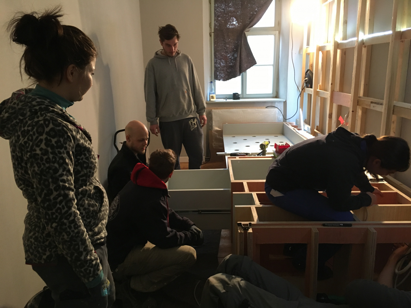Inzwischen war der Raum gestrichen und soweit vorbereitet, dass der Einbau erfolgen konnte. Der örtliche Installationsbetrieb (Fa. Bigeschke) unterstützte die Studierenden wo möglich. Bald war eine Werkstatt im Nebenzimmer eingerichtet, wo die Studierenden rund um die Uhr arbeiteten. Die Heizung war bereits angeschlossen, denn im alten Gemäuer wurde es zusehends kälter, die Anschlüsse für Frisch- und Abwasser waren durch den stillgelegten Kamin gelegt. Richtig eng wurde es am Wochenende vor der Abgabe. Die Gasdruckfedern, die das Bewegen der Klappen erleichtern sollten, waren zu stark, so dass die Scharniere auszubrechen drohten und das Waschbecken war beim Transport verschollen. So musste kurzfristig Ersatz besorgt werden. Die Matratze kam einen Tag vor der Präsentation. Das Bettzeug brachten die Professoren zu den Kolloquien mit.
