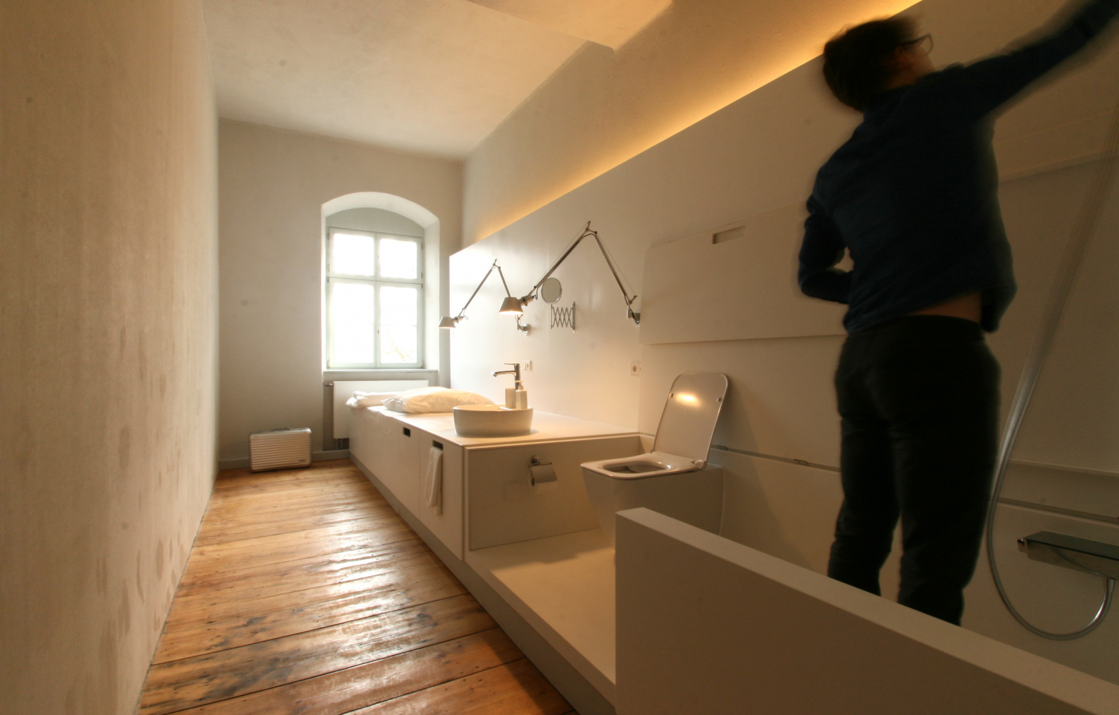 Innerhalb des genannten Konzeptes war der geeignete Raum im Schloss zu finden, ein tragfähiges Konzept zu entwickeln und dieses bis zur Baureife durchzuplanen. Während die Komplexität der Entwurfsaufgabe der eines Erstsemester-Stegreifs entspricht, waren die Anforderungen an die Ausarbeitung naturgemäß hoch. Elektro- und Sanitärplanung, Möblierungs- und Beleuchtungskonzept waren inklusive einer dezidierten Bauanleitung, zuzüglich Kostenschätzung und Ablaufplanung in nur sechs Wochen zu erarbeiten. Es folgte die Auswahl eines Konzeptes, das für die Realisierung anstand. Die Wahl fiel auf das Konzept von Nick Gemmecke, einem sideboard-artigem Möbel, das den schmalen Raum längs begleitet. In ihm sind sämtliche Funktionen integriert: Schlafen, Aufbewahren, WC, Dusche und Waschbecken und zwar so, dass man sie bei Bedarf auf- und zuklappen kann.