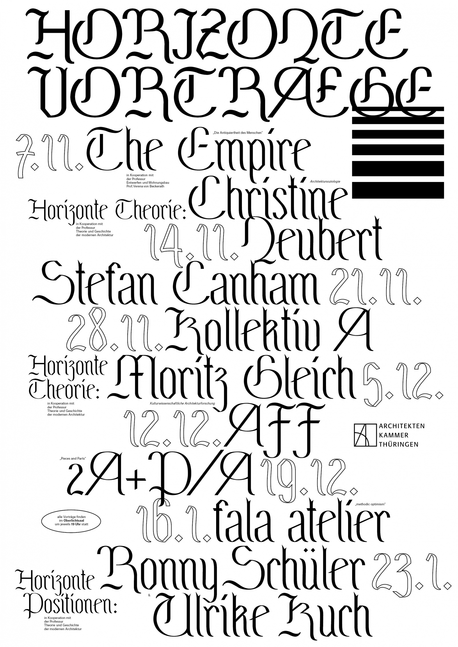 Die Vortragsreihe wird veranstaltet von horizonte, einer studentischen Initiative an der Bauhaus-Universität Weimar, die seit 1992 im Sinne einer Werkschau von Architektur, Kunst und Design unterschiedliche Theorien, Objekte und Berichte präsentiert.