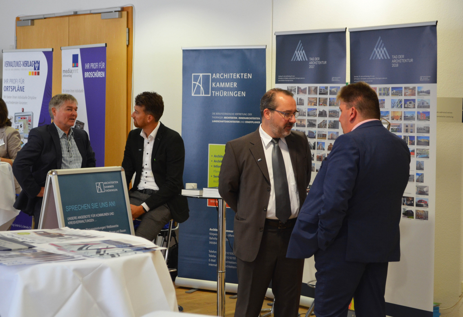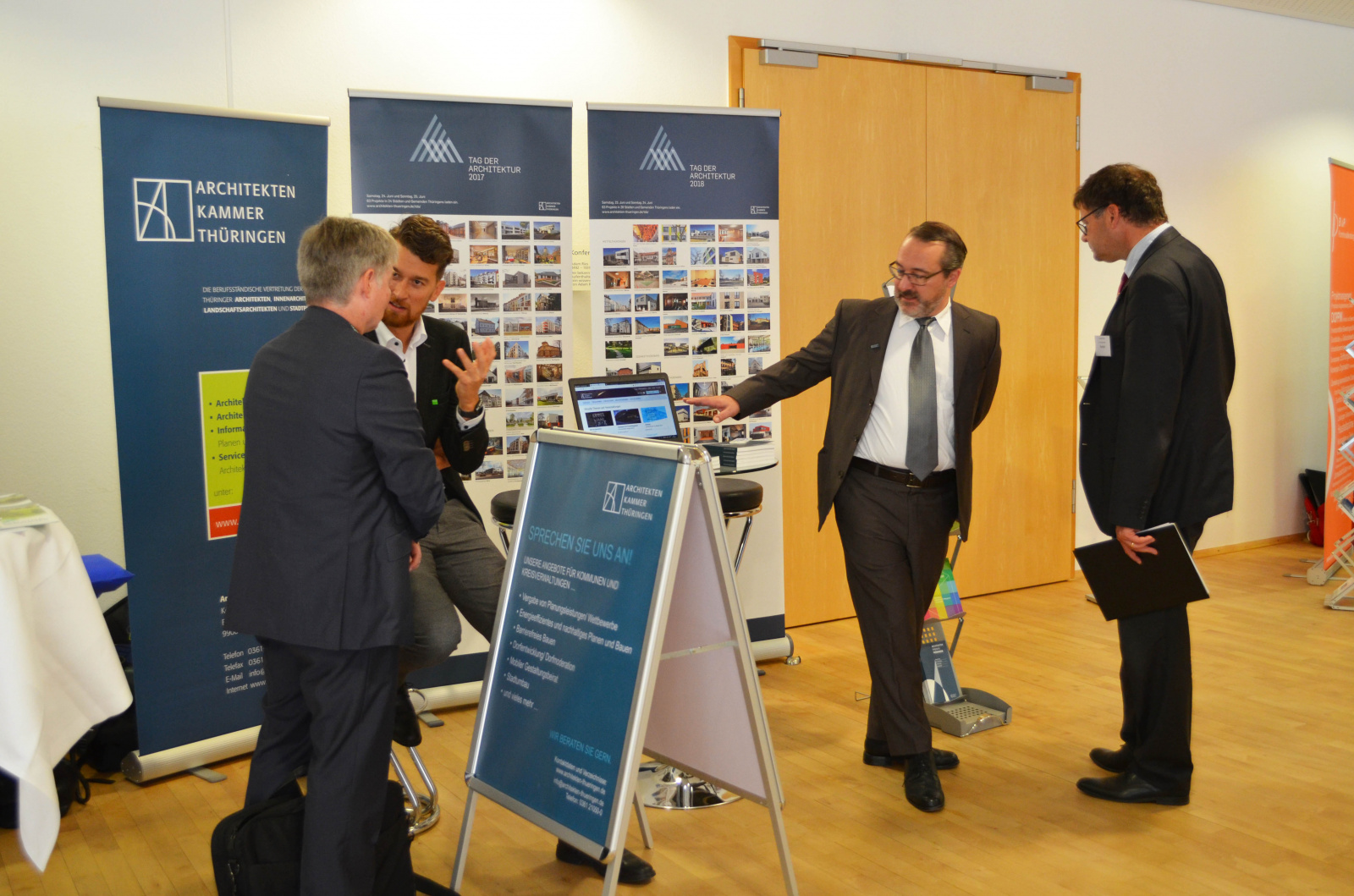Zur 29. Mitgliederversammlung des Gemeinde- und Städtebundes Thüringen am 28. September auf der Messe Erfurt präsentierte sich die Architektenkammer Thüringen auf der begleitenden Informationsbörse zum zweiten Mal in Folge mit einem eigenen Stand. Im Mittelpunkt des Auftritts standen Informationen zu den Leistungsangeboten der Kammer und ihrer Mitglieder für den Kommunalbedarf, insbesondere zur Vergabe von Planungsleistungen sowie zur Dorfentwicklung und Dorfmoderation.