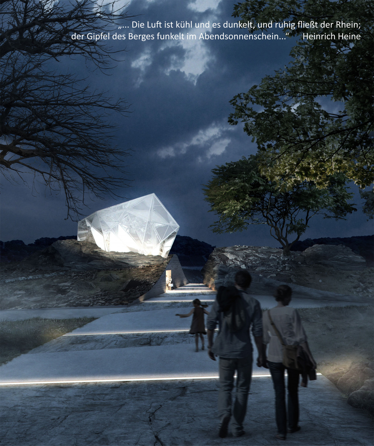 Das Preisgericht begrüßt den klaren Ansatz des Entwurfes, der die Potentiale des Standorts (Felsen, Panorama und Topographie) sowie die Mystik der Loreley überzeugend transportieren kann. Positiv wird die Haupterschließung betrachtet, die bis zu einer zentralen Empfangszone, dem Besucher- und Kulturzentrum, führt. Das nördlich hiervon begleitende Parkplatzband ist harmonisch im Gehölz integriert. Von der Empfangszone bis zur Spitze des Loreley-Plateaus werden die Besucher über eine Felsspalte geführt, die den Schiefer mit einem Weg zerschneidet und sich langsam bis zum Ende, dem Felsenplateau, zuspitzt. Dort öffnet sich ein breites Rheintalpanorama. Ruhe, Kontemplation und Mythos werden im mittig angeordneten Landschaftspark durch einen sich mäandernden Weg erfahrbar gemacht. Dieser verbindet verstreut angeordnete, kristallförmige, gebaute Elemente, die Tag und Nacht unerwartete Überraschungen bieten. Südlich vom Landschaftspark fügt sich ein auf den Ort abgestimmter gelungener Hotelentwurf als Erweiterung der Weinbergsterrassen sensibel in den Hang ein. (...) Im Sinne einer touristischen Inwertsetzung ist diese Arbeit sehr gelungen. Es ist der mit Abstand mutigste Entwurf, der allein durch seine gestalterische Ausformung hohe mediale Aufmerksamkeit und Besuchsimpulse auslösen wird.