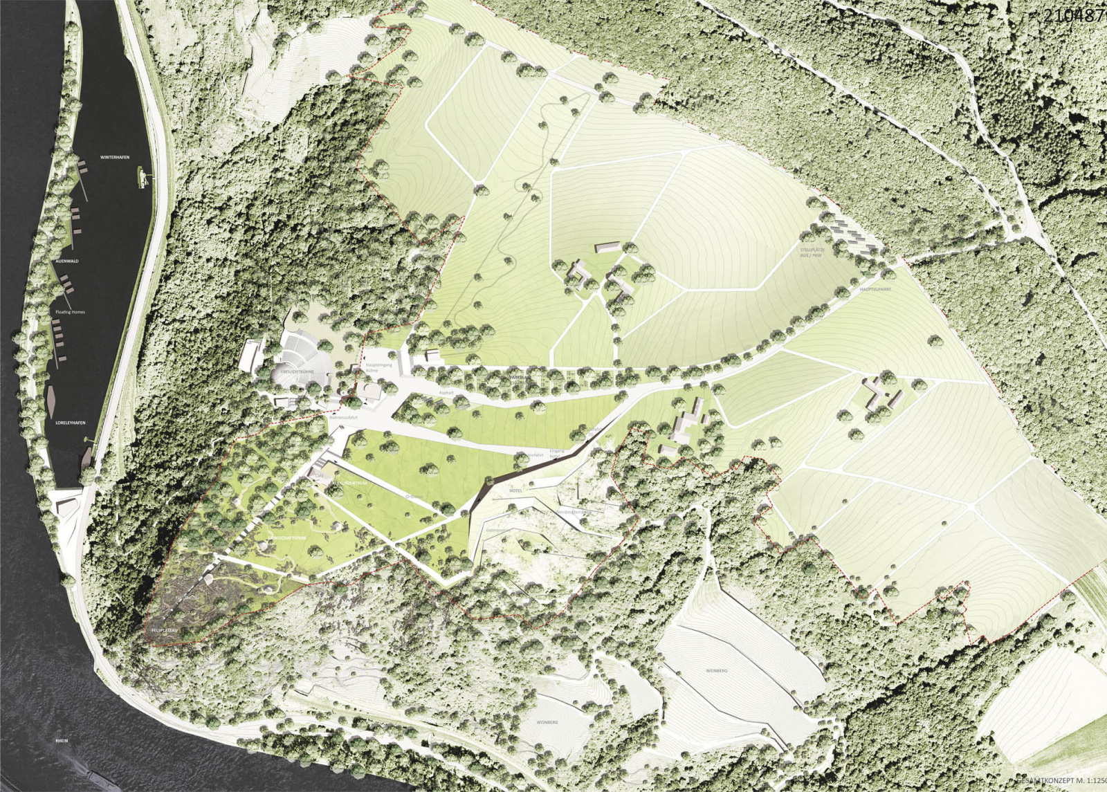 Die räumliche Konzeption der Gliederung des Loreley-Plateaus in drei klar definierte Bereiche mit den ihnen zugeordneten Erschließungsringen ist in sich schlüssig und im Entwurf überzeugend umgesetzt. Hervorzuheben ist die klare Strukturierung der jeweiligen Flächen in Verbindung mit ihrer thematischen Besetzung und insbesondere entlang der Wegeführung wie „Panoroma-Walk“ oder „Info-Welle“. Hierbei sind die Baumgruppen in ihrer Einfachheit, raumbildenden Wirkung und funktionalen Bedeutung gestalterisch konsequent und richtig eingesetzt. Die Spitze des Plateaus, der Loreley-Felsen, wird durch seine Erschließung „durch den Felsen“ zu einem dramaturgischen Höhepunkt der Erschließung des Plateaus und des Erlebnisses „Loreley“ entwickelt. Durch die Inszenierungselemente „Lauschkanzel, Klang und Echo“ wird diese Wirkung noch verstärkt.