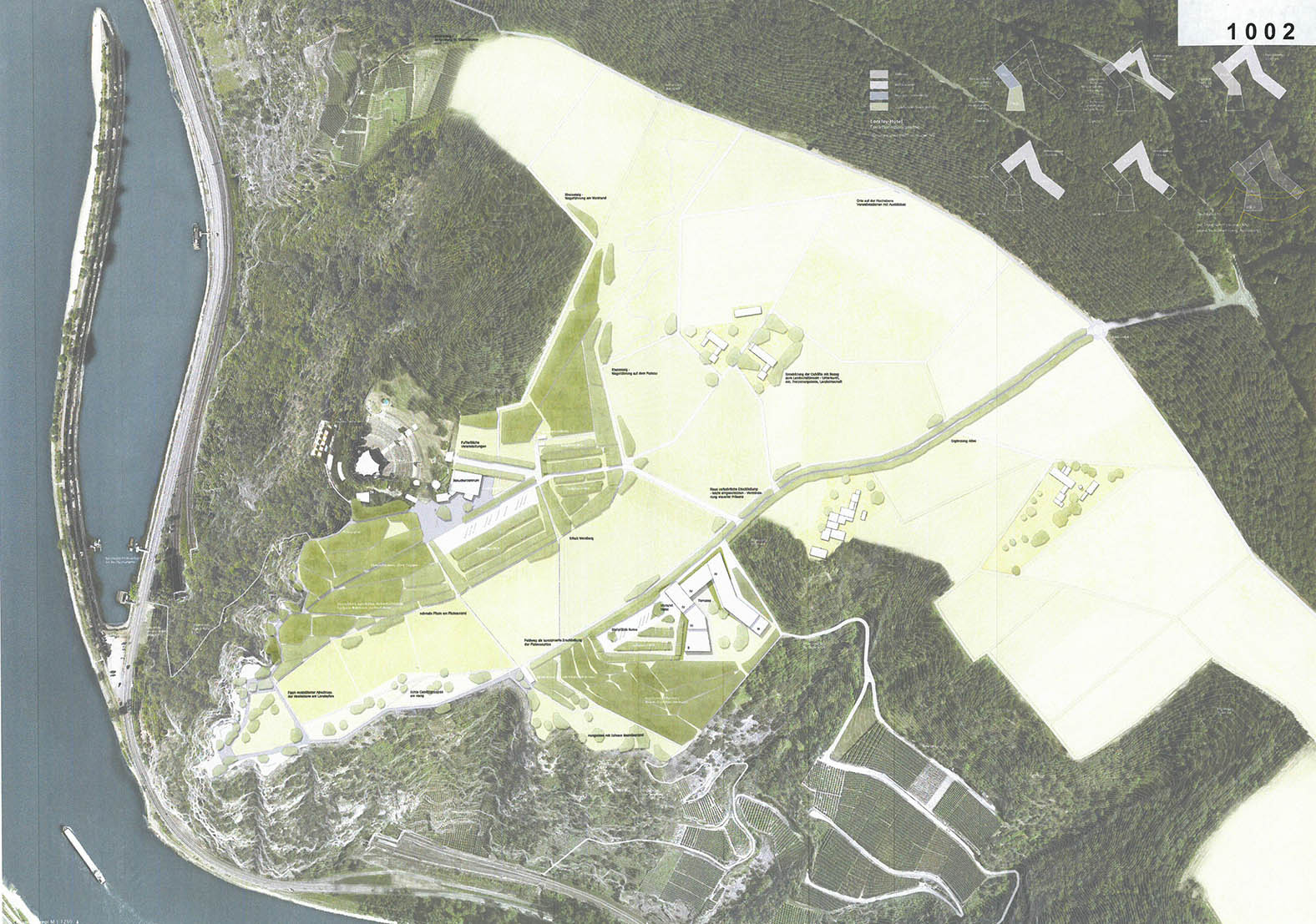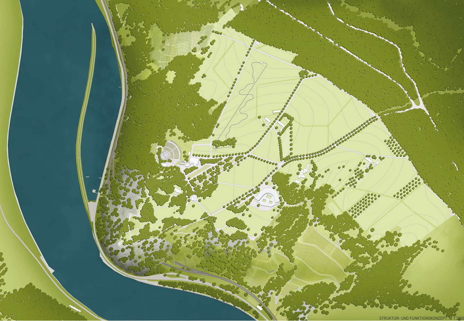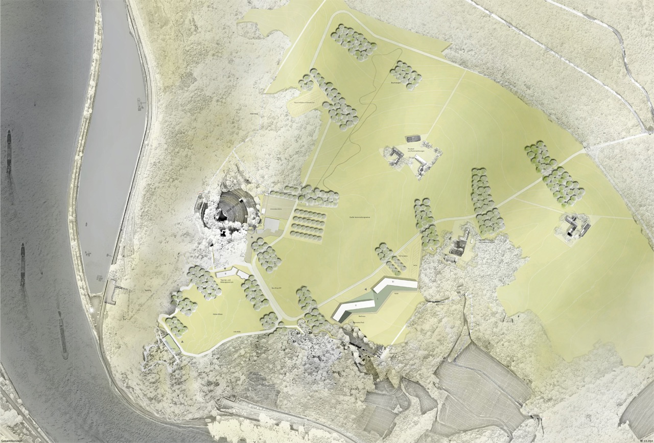 Die Entwurfsverfasser schlagen die spannungsvolle Freilegung und Inszenierung der heute vielfach verstellten Kulturlandschaft vor. Die gestaffelte pflanzliche Ergänzung der vorgefundenen Vegetationsstrukturen gibt der Landschaft räumliche Tiefe und lenkt den Blick auf das Felsplateau. Das Preisgericht nimmt positiv zur Kenntnis, dass diese Staffelungen bestehende, aber auch neue bauliche Einrichtungen einbinden oder gar abschirmen. Der Fokus des Besuchers wird eindeutig zur Plateauspitze gelenkt. Insbesondere der Vorschlag, einzelne Felspartien bereits in der Rasenfläche freizulegen und so das Plateau anzukündigen, findet beim Preisgericht große Zustimmung.