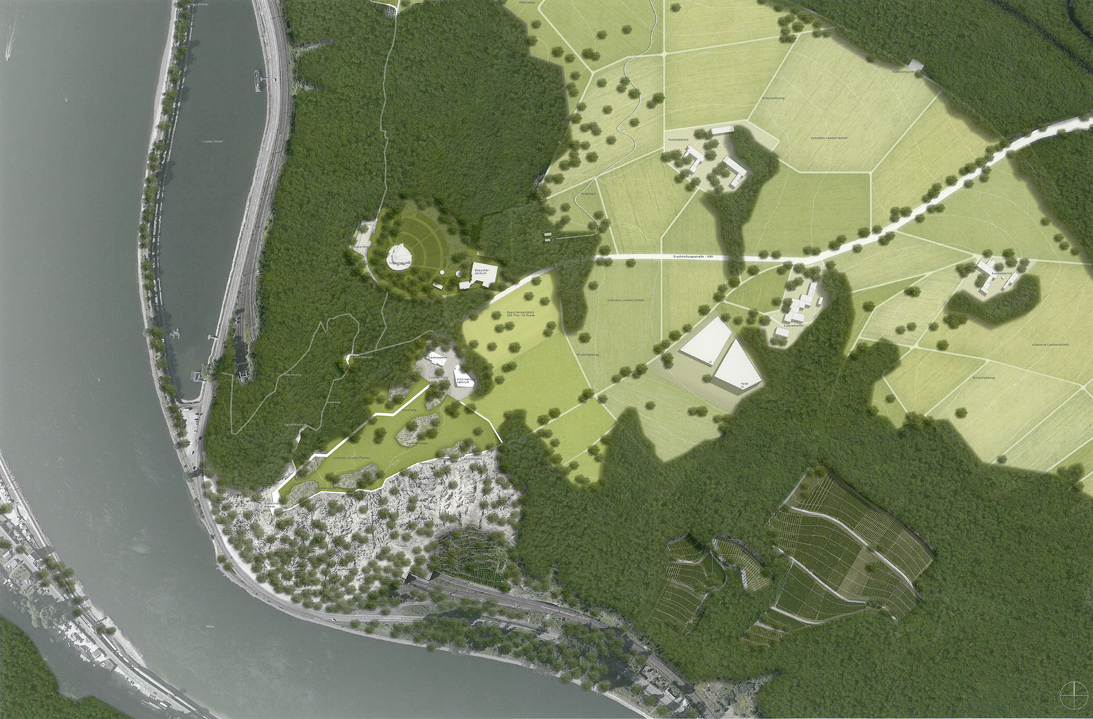 Das Loreleyplateau wird in zwei Bereiche gegliedert, die fließend ineinander übergehen. Entsprechend der aktuellen Landnutzung wird der Besucher über landwirtschaftliche Nutzflächen an einen Landschaftspark geführt, der in einer abwechslungsreichen Raumabfolge die vorhandenen, aber auch neuen Nutzungen und Attraktionen aufnimmt. Durch die labyrinthische Anordnung der Vegetation wird Spannung und Neugierde aufgebaut, die Orientierung jedoch auch gleichsam erschwert. Die Interpretation des Mythos Loreley mit Kunst – und Spielelementen in den auf einander folgenden Räumen wird positiv gewertet. Mit behutsamen Mitteln und geringem Eingriff in die vorhandene Topografie werden attraktive Ausblicke inszeniert und neu geschaffen.