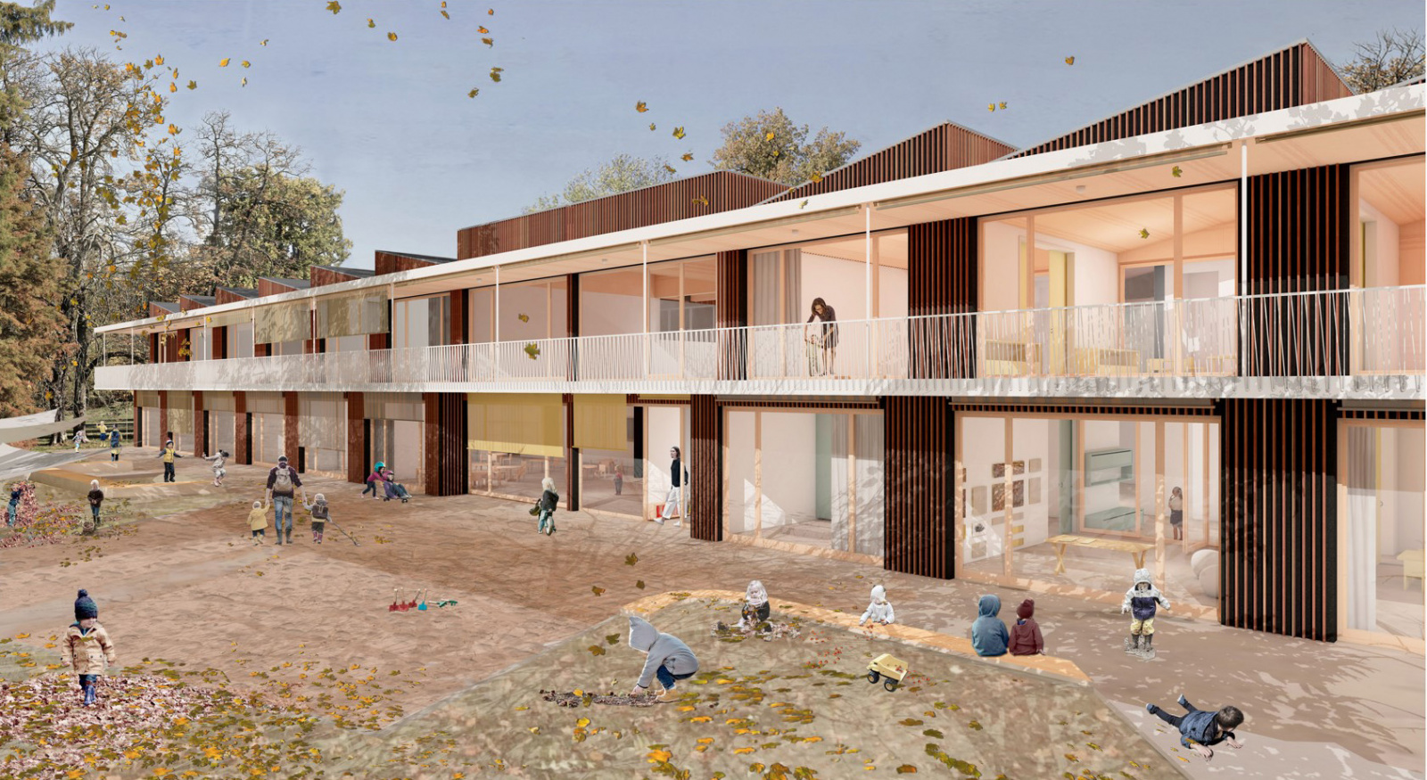 Das Preisgericht unter Vorsitz des Weimarer Architekten Andreas Reich zeichnete unter 15 zugelassenen Arbeiten den Entwurf von Schettler & Partner mit plandrei Landschaftsarchitektur mit dem ersten Preis aus. Dieser löse die Aufgabe sehr überzeugend und integriere den Kindergarten auf geschickte und angenehme Weise in den Park. „Dazu tragen neben der hervorragenden inneren Raumstruktur nicht zuletzt die leichten, mit Holz verkleideten Fassaden bei“, lautet es in der Beurteilung.