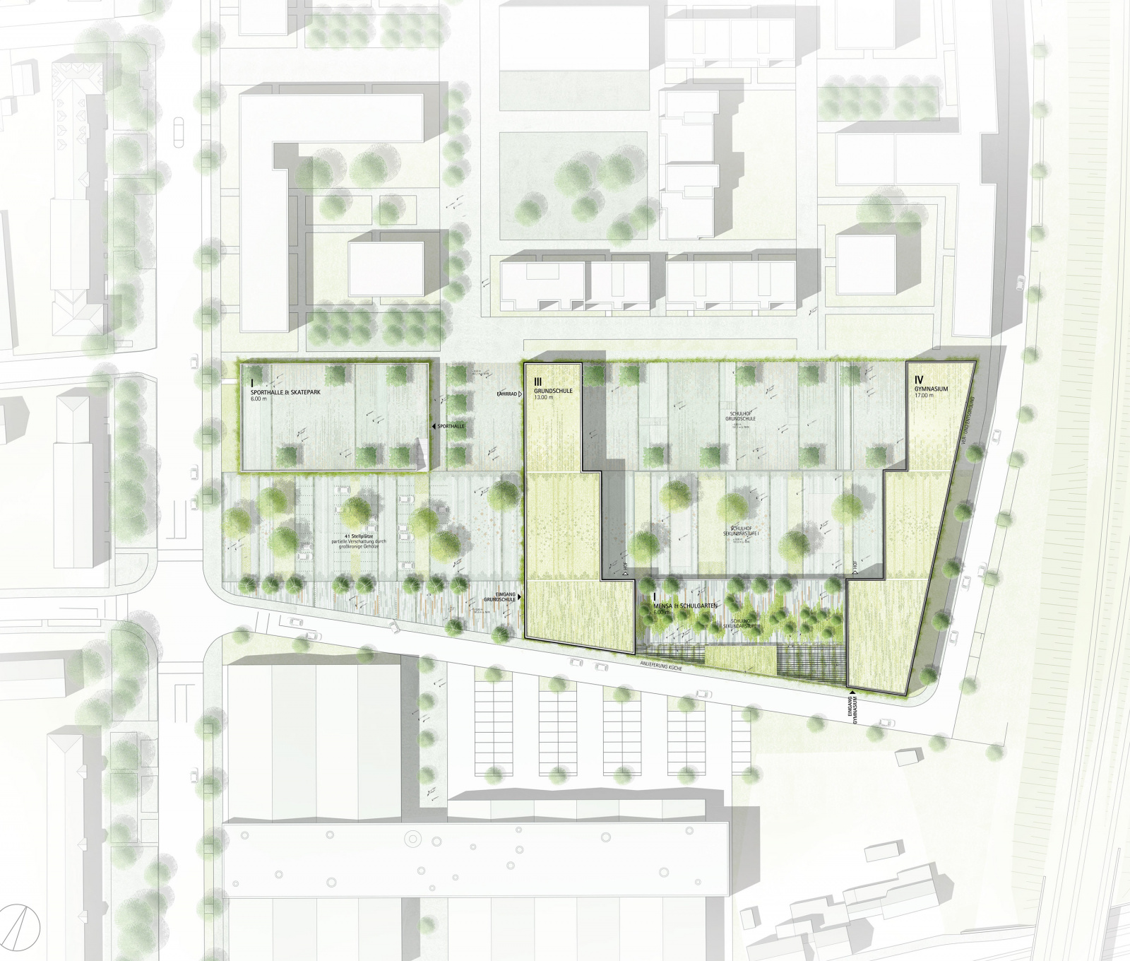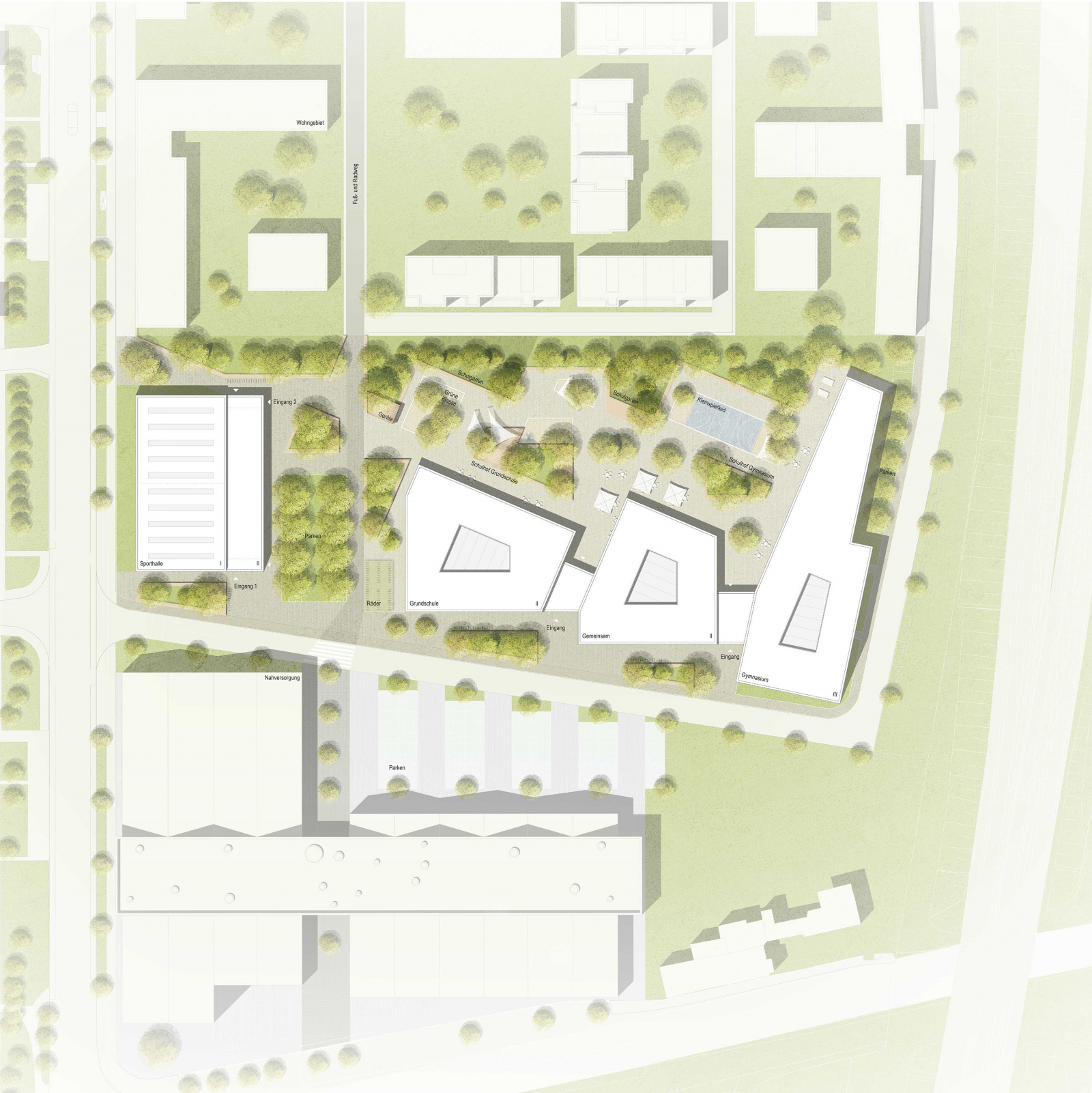 Das Konzept der Freiräume greift in spielerischer Weise die Gebäudekonfiguration auf und entwickelt vielfältige Nutzungsangebote in unterschiedlichen räumlichen Konstellationen. Während der Rand zur Wohnbebauung eine dichte Abpflanzung erhält, werden die Pausenflächen in sonnige und schattige Bereiche gegliedert. Es gibt sowohl aktive als auch ruhige Räume, eine Zuordnung zu den beiden Schulen ist gut möglich. Auch die Vorplätze werden durch Pflanzungen akzentuiert, so dass letztlich ein tatsächlich grüner Schulcampus entsteht.