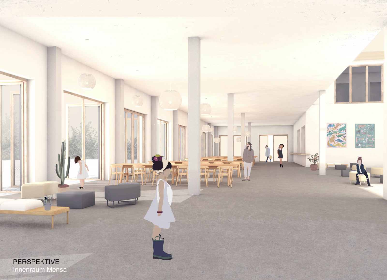 Die Grundschule erscheint als eigenständiger Baukörper und ist damit für die jungen Schüler:innen gut auffindbar. Beide Eingänge sind deutlich zu erkennen und jeweils so positioniert, dass eine Erschließung der mittig angesiedelten Gemeinschaftsräume als auch der beiden Schulbereiche möglich ist. Die Möglichkeit einer außerschulischen Nutzung der Gemeinschaftsräume in den Abendstunden ist damit ebenfalls gegeben. Durch die polygonale Form ergeben sich auch im Inneren interessante, gut nutzbare Gemeinschaftsflächen, die insbesondere in der Grundschule eine gemeinsame Mitte erzeugen und zur guten Orientierung in diesem Gebäudeteil beitragen.