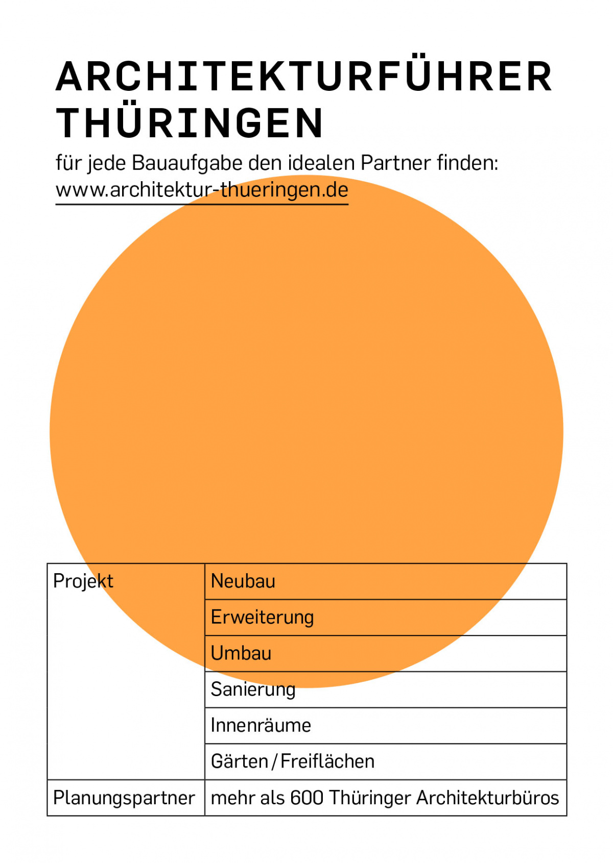 Erstmals verteilt werden die Flyer zur Haus.Bau.Ambiente. vom 8. bis zum 10. November in Erfurt. Vor Ort am Stand 2-122 bietet die Kammer zum einen individuelle und unverbindliche Erstberatungen für bauwillige Bürgerinnen und Bürger an. Zum anderen präsentiert sie auf einem Touch-Infopoint mit dem Architekturführer Thüringen ihr Online-Portal für Bauherren. Bauinteressierte können so aus mehr als 2500 Projekten in Thüringen wählen, sich inspirieren lassen und für jedes Bauvorhaben das passende Architekturbüro finden.
