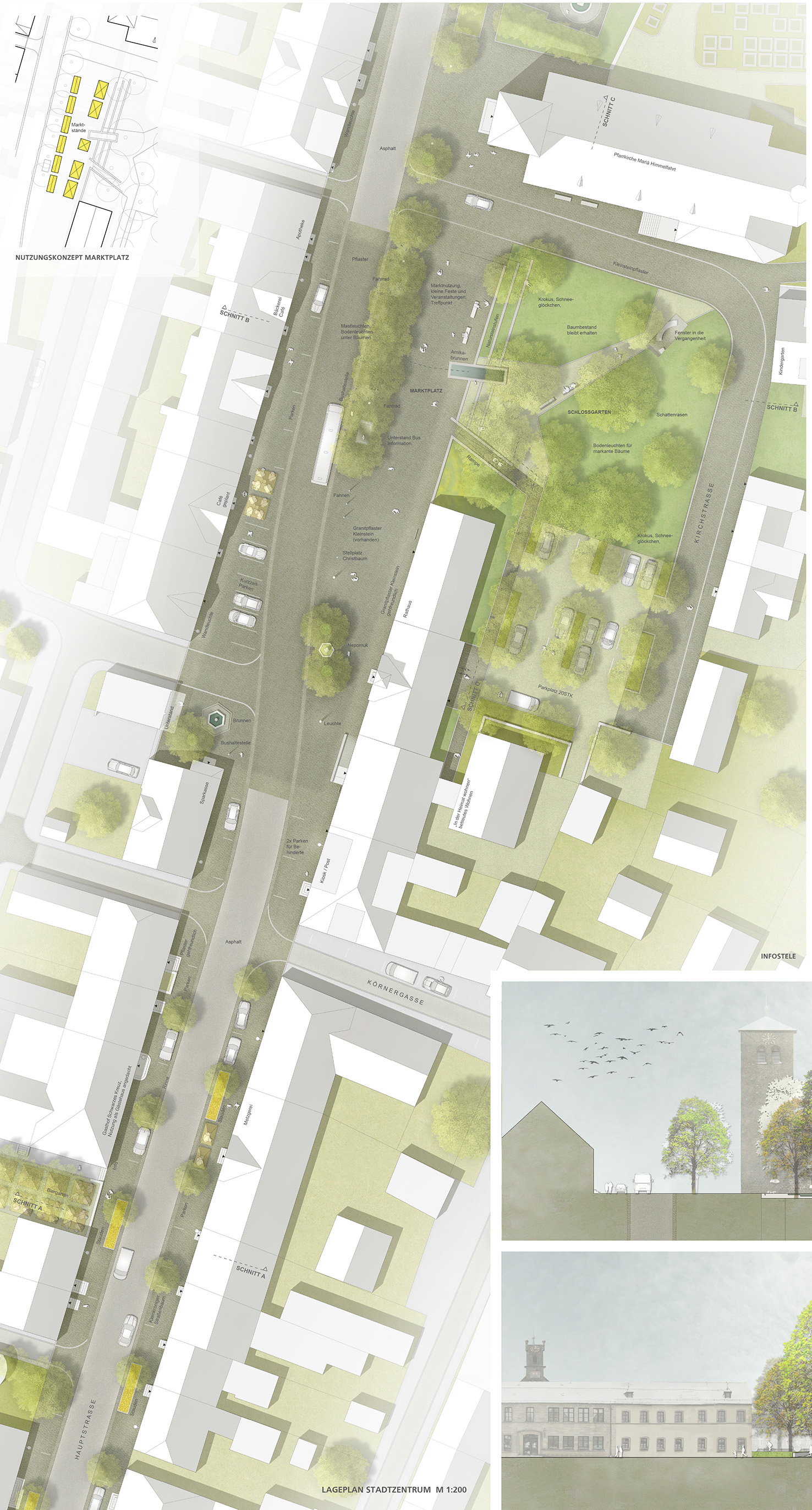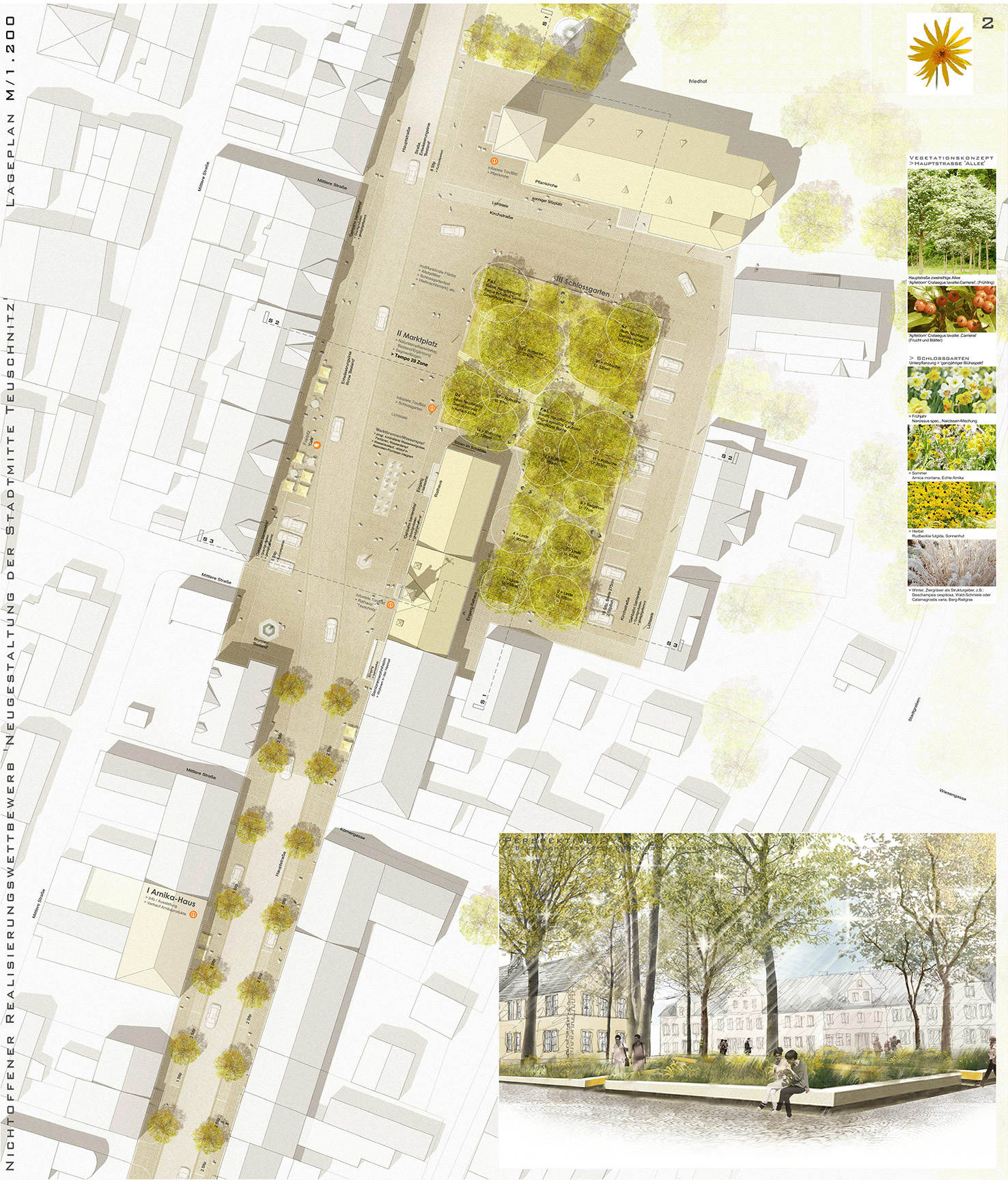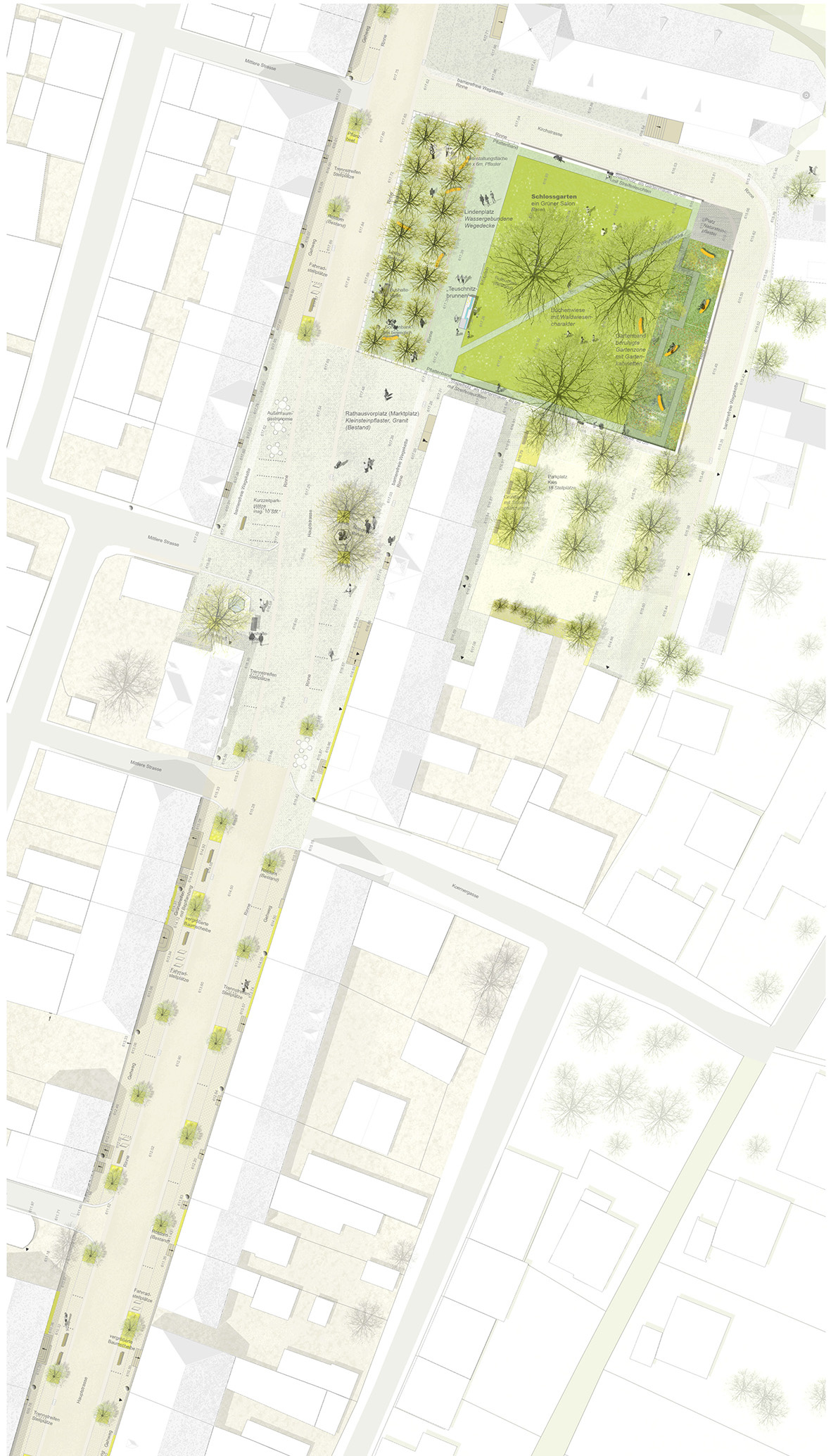 „Die Arbeit interpretiert das gewachsene Gefüge der Teuschnitzer Innenstadt neu und versucht durch den Bezug zur Geschichte einen eigenständigen Beitrag zu entwickeln. Auftakt zum Marktplatz bildet die umgestaltete Hauptstraße. Die Gehwege werden durch einen neuen Belag aus gesägtem Granitsteinpflaster neu gestaltet. Die gewünschte Barrierefreiheit wurde umgesetzt. Der Erhalt des Baumbestandes wird positiv bewertet. Der Markplatz wird als klar ausformulierte Fläche ausgearbeitet. Das Bestandspflaster wird in die Gestaltung integriert und die Randbereiche durch barrierefreie Laufbänder aus gesägtem Granitpflaster ergänzt. Das vorgeschlagene Wasserspiel wird als Bereicherung des Platzes empfunden und positiv bewertet. Im Zusammenspiel mit dem vorgeschlagenen Beleuchtungskonzept entsteht ein feiner Übergang zur benachbarten Schlossterrasse.“