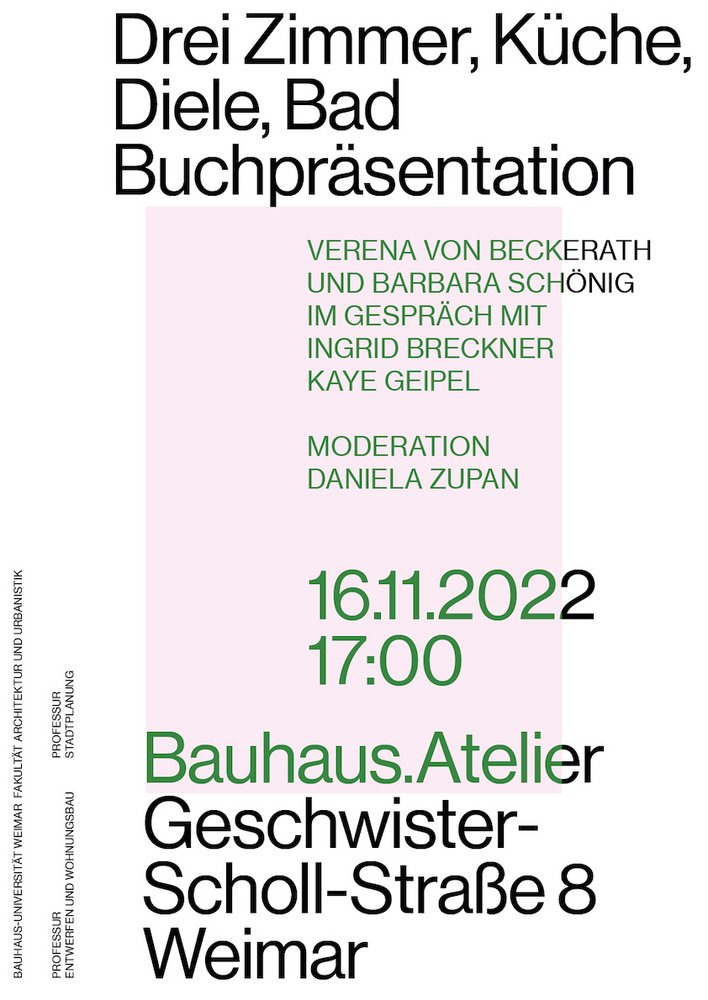 Anlässlich der Veröffentlichung von »Drei Zimmer, Küche, Diele, Bad: Eine Wohnung mit Optionen« laden die Herausgeberinnen Verena von Beckerath und Barbara Schönig am Mittwoch, 16. November 2022, um 17 Uhr zur Buchpräsentation und einem Gespräch ein. Das Gespräch zwischen den Herausgeberinnen und den Gästen Ingrid Breckner, Stadt- und Raumsoziologin und Professorin i.R. HafenCity Universität Hamburg, und Kaye Geipel, Architekturkritiker, Stadtplaner und Kurator, wird moderiert von Daniela Zupan.