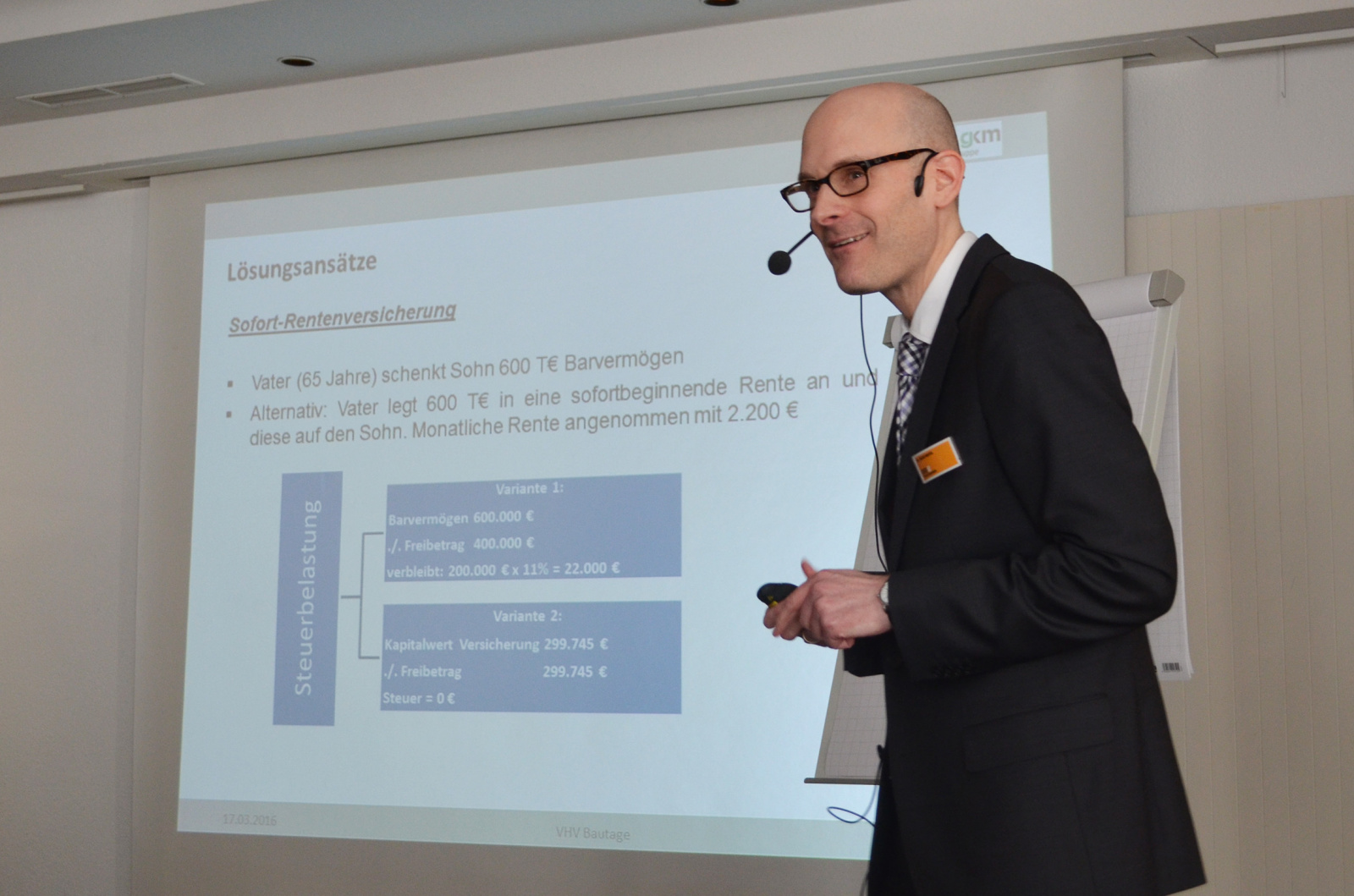 Zuvor gab RA Markus Cosler, Fachanwalt für Bau- und Architektenrecht, ein Update im Baurecht 2016. Über Stressphänomene und kluges Selbstmanagement referierte Dr. Michael Schonnebeck von der Psychosomatischen Tagesklinik in Köln. Einblicke in das Building Information Modeling gab Dipl.-Ing. Jörg Sando, beratender Ingenieur aus Weimar. Erbschaftssteuerreform und Unternehmensnachfolge sowie Versicherungslücken waren die weiteren Vorträge der mit mehr als einhundert Teilnehmern erneut sehr gut besuchten Tagung überschrieben.