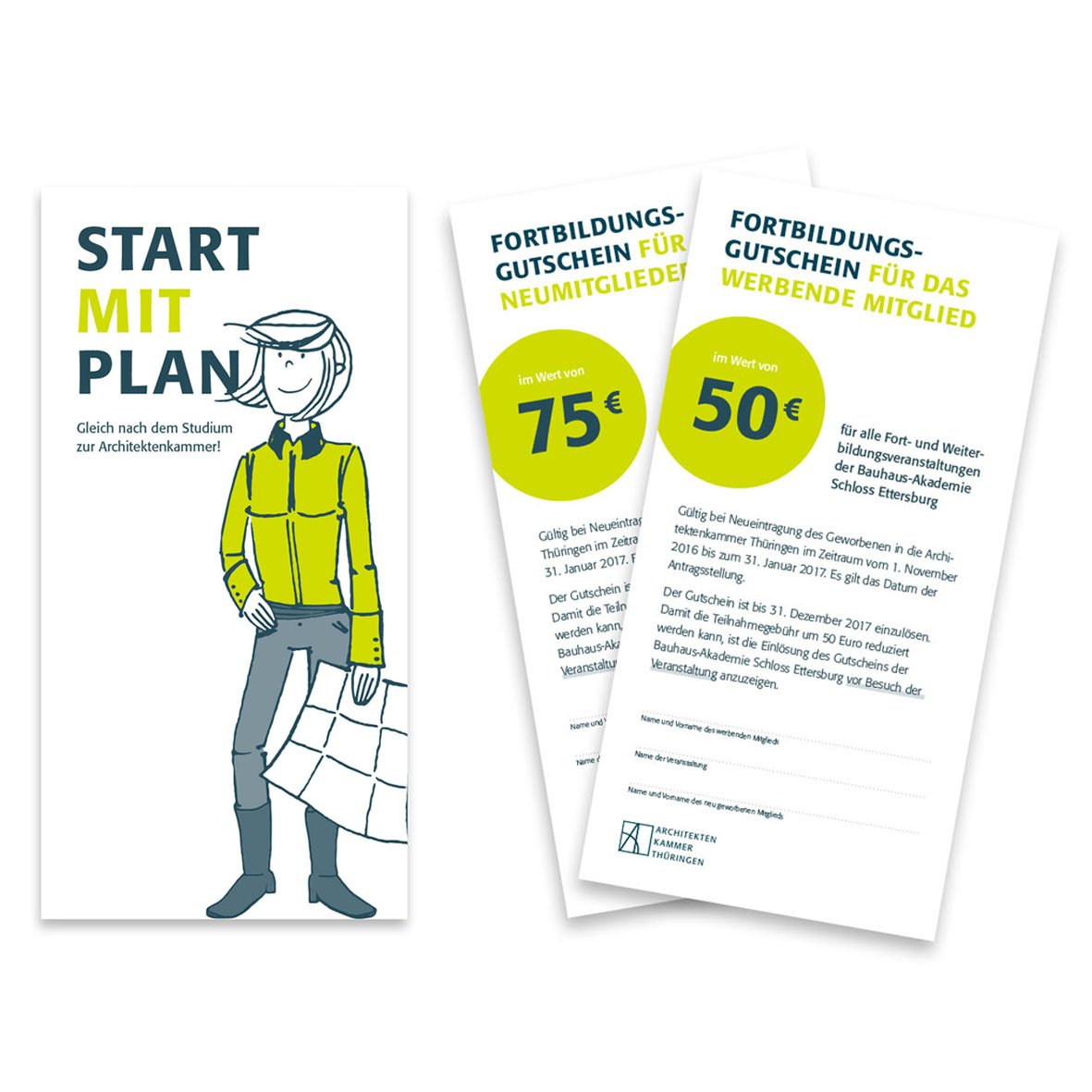 Da es bislang an einer Handreichung mit den wichtigsten Informationen zur freiwilligen Mitgliedschaft fehlte, wurde ein neues Faltblatt zur Ansprache von Studierenden und Absolventen entwickelt. Das Faltblatt „Start mit Plan“ soll zu den unterschiedlichsten Anlässen im persönlichen Kontakt weitergereicht werden, aber auch in Prüfungsämtern, der Fachstudienberatung und den Careers Services ausliegen. Thüringer Absolventen werden es zudem im Rahmen ihrer Graduierungsfeiern erhalten. Das Faltblatt bildet in Gestaltung und Botschaft auch die Basis für weitere Aktivitäten auf der AKT-Website und in den Sozialen Medien.