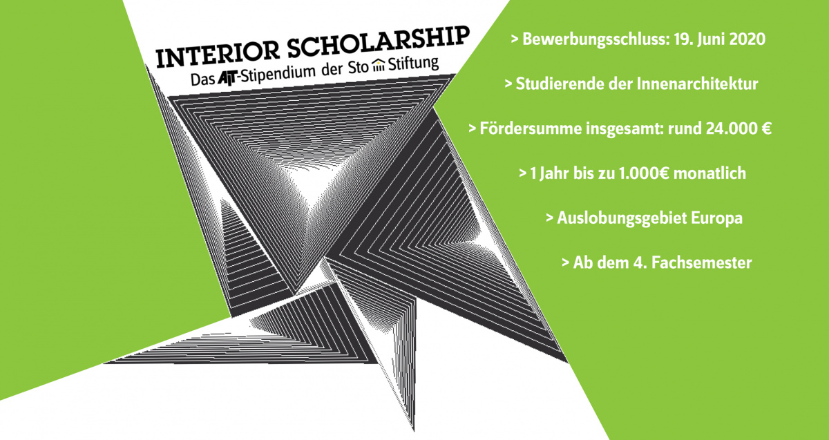 Die gemeinnützige Sto-Stiftung vergibt zusammen mit AIT das „AIT Interior Scholarship“, Europas einziges Stipendium für Studierende der Innenarchitektur sowie verwandter Studiengänge wie Szenografie, Spatial Design und Raumstrategien. Die AIT ist eine Fachzeitschrift für Architekten und Innenarchitekten. Sie setzt ihren Schwerpunkt auf die Innenraumgestaltung und den Innenausbau. Die Stiftung fördert seit 15 Jahren junge Architekten in ihrer Ausbildung. Für das Jahr 2020/2021 werden vier Stipendien im Wert von monatlich bis zu 1.000 Euro ausgelobt. Bewerbungsschluss ist der 19. Juni 2020.