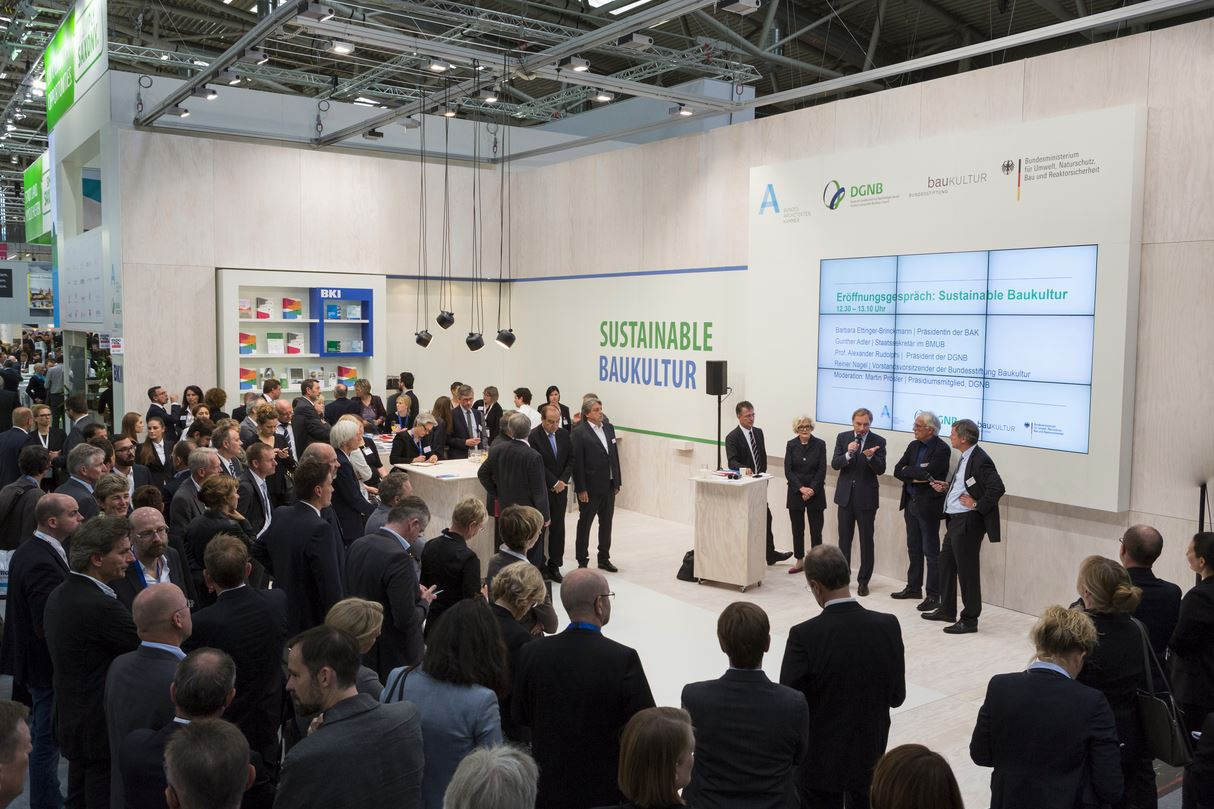 Florian Pronold, Parlamentarischer Staatssekretär im Bundesministerium für Umwelt, Naturschutz, Bau und Reaktorsicherheit (BMUB), BAK-Präsidentin Barbara Ettinger-Brinckmann, Christine Degenhart, Präsidentin der Bayerischen Architektenkammer, DGNB-Vize-Präsident Hermann Horster und der Vorsitzende der Bundesstiftung Baukultur, Reiner Nagel, werden ihre gemeinsame Messepräsenz am 4. Oktober eröffnen.