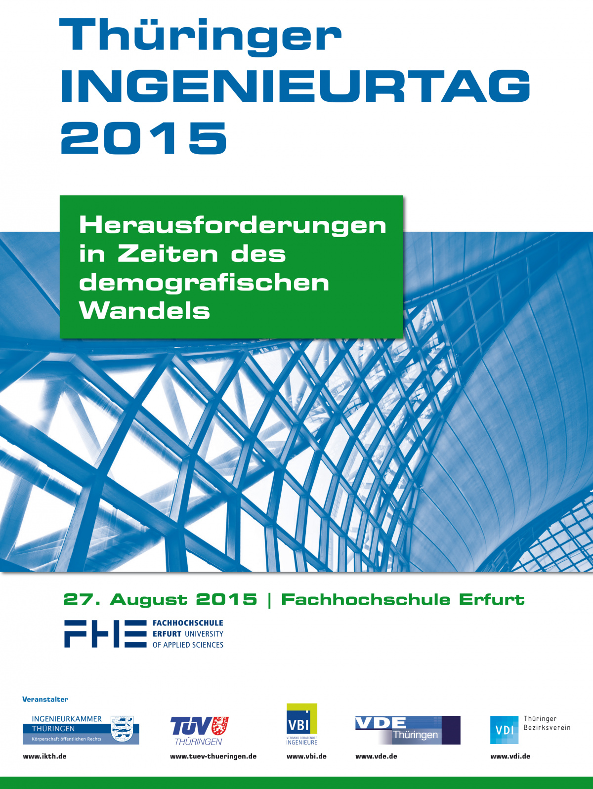 Die Ingenieurkammer Thüringen veranstaltet gemeinsam mit TÜV Thüringen e. V., VBI Landesgruppe Thüringen, VDE Thüringen und VDI Thüringer Bezirksverein am 27. August 2015 den 1. Thüringer Ingenieurtag unter dem Motto „Herausforderungen in Zeiten des demografischen Wandels“ an der Fachhochschule Erfurt.