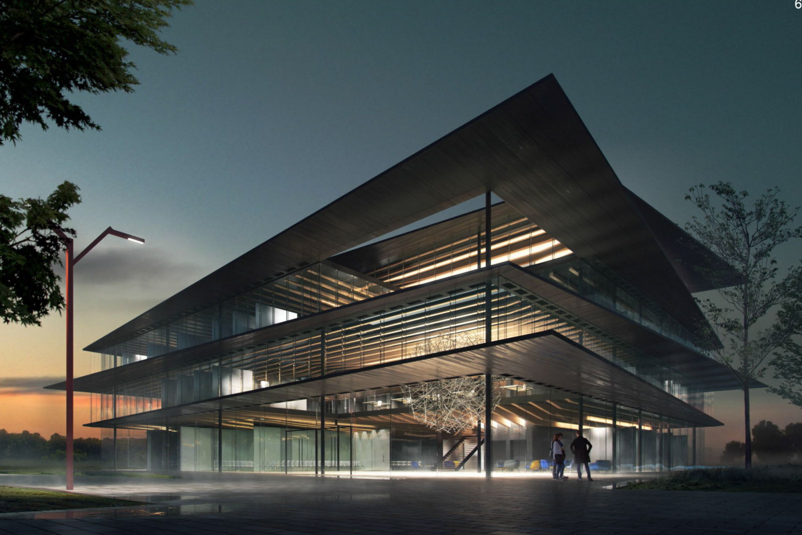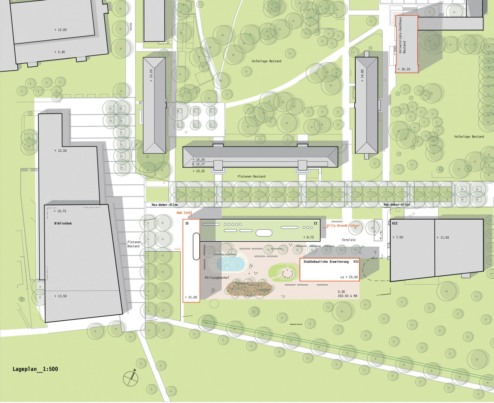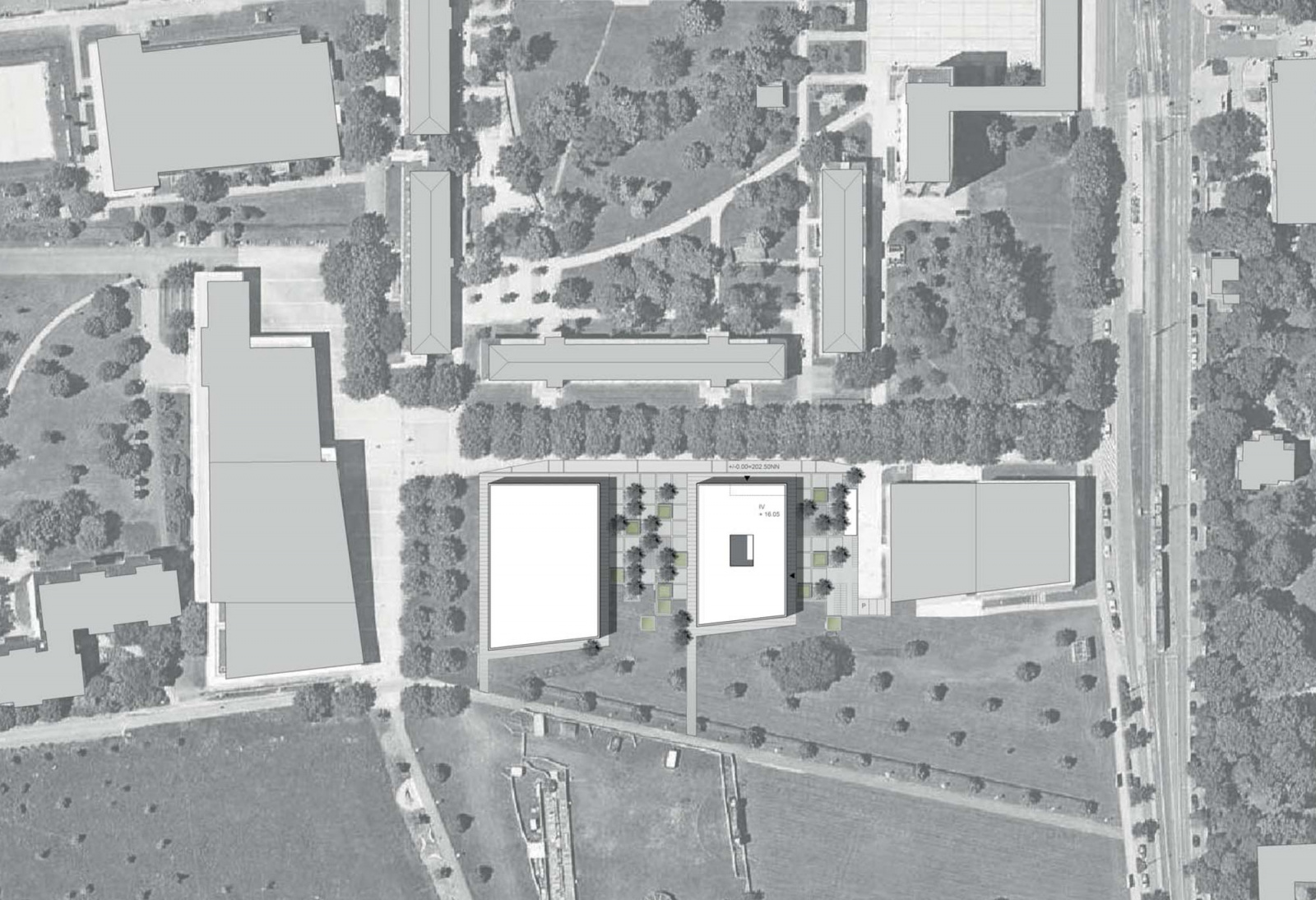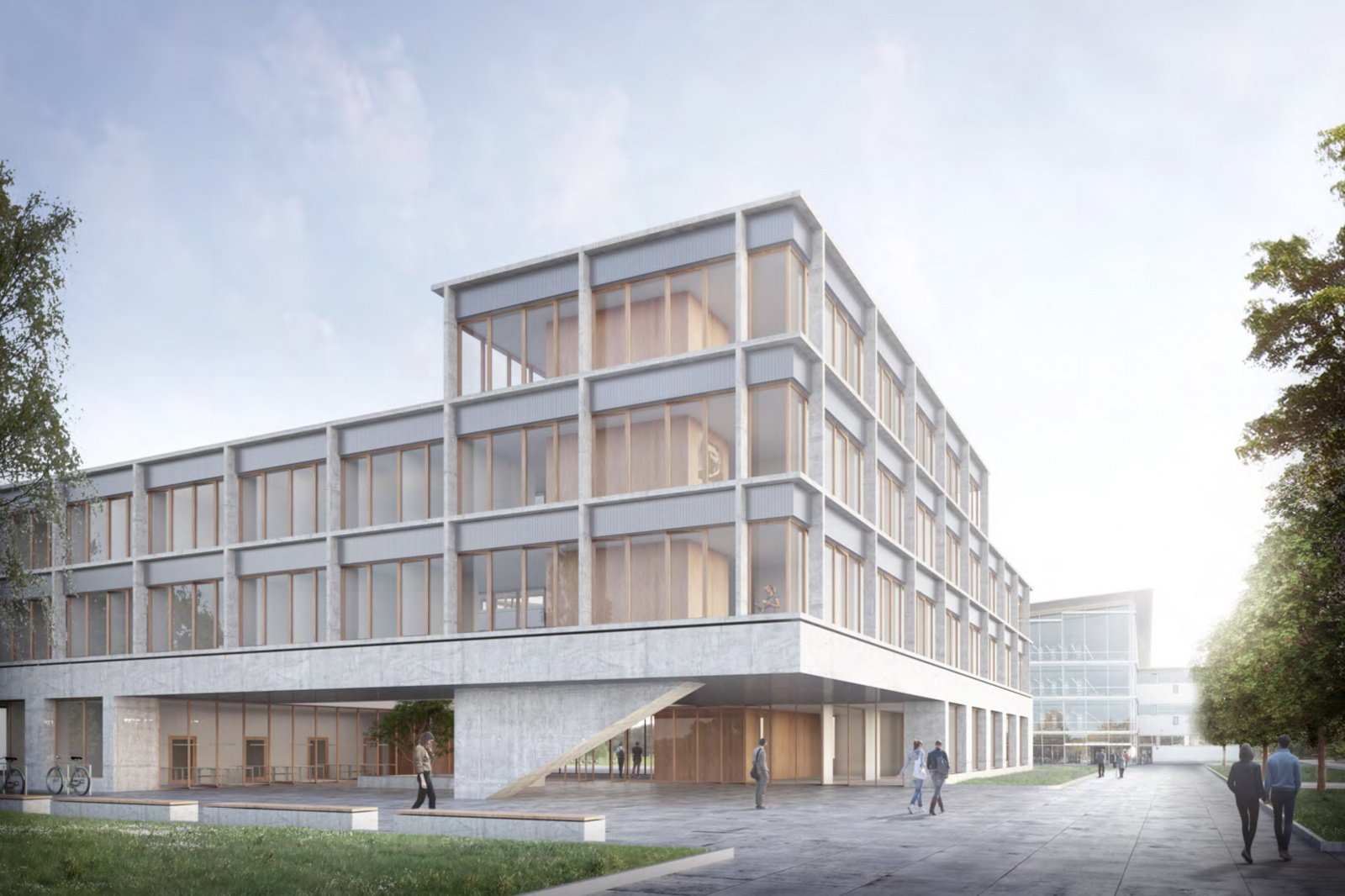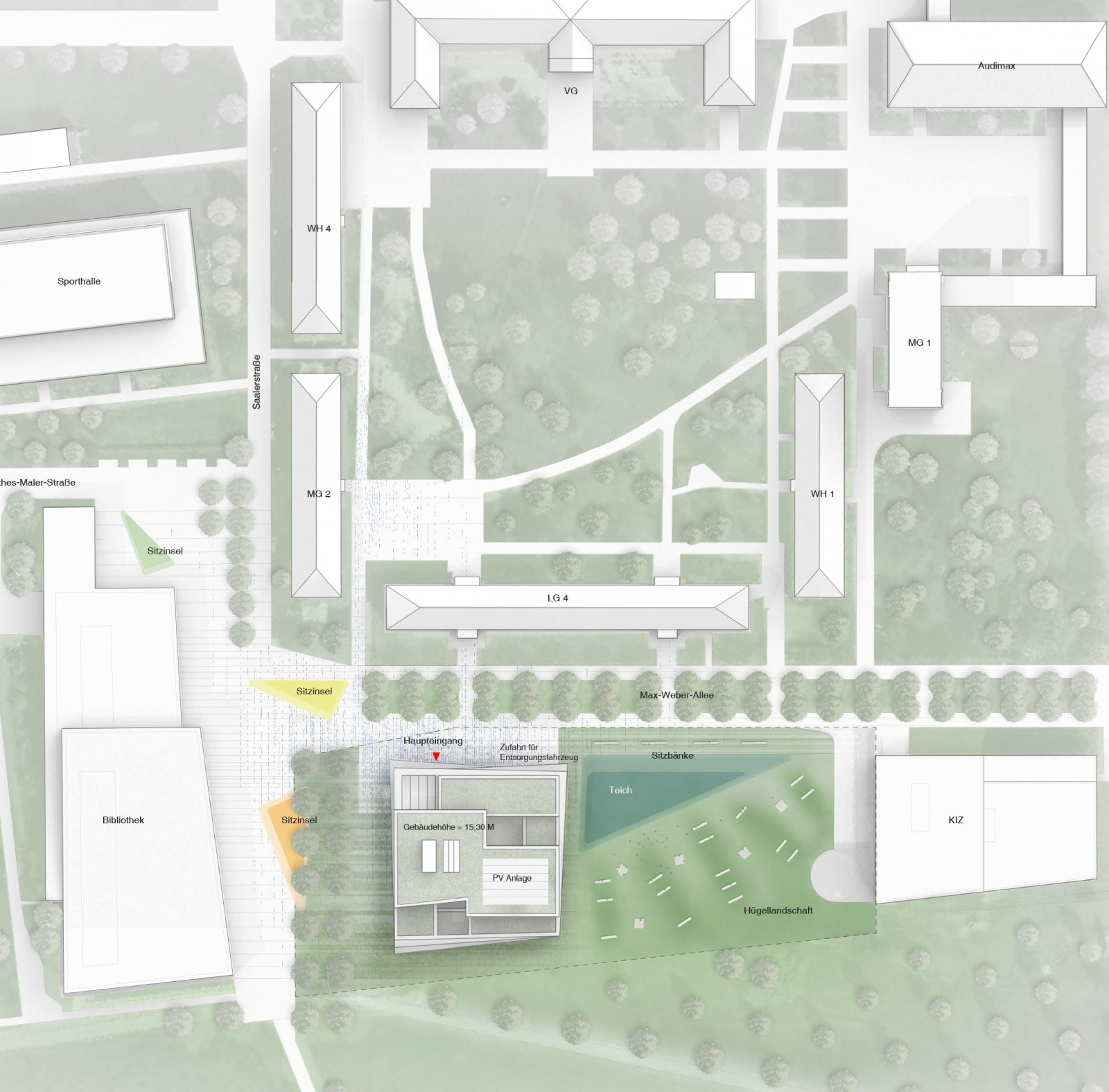 Der Baukörper besetzt das zur Verfügung stehende Baufeld abzüglich einer Erweiterungsfläche etwa gleicher Größe unter Formulierung zwei unterschiedlich gewidmeter Platzräume, die zugleich den Übergang vom Campus zum angrenzenden Landschaftsraum im Süden mit differenzierten Freiraumangeboten ausformulieren. Elemente der Freiraumgestaltung reflektieren die Fassadenproportionierung in der Horizontalen und lassen den Parkraum gelungen in den Campusraum einfließen. Die 4-Geschossigkeit setzt ein baulich markantes Zeichen und nimmt dabei sowohl die Trauf- als auch die Firstlinie der Nachbarbebauung auf, was zur Harmonisierung der angrenzenden Räume beiträgt.