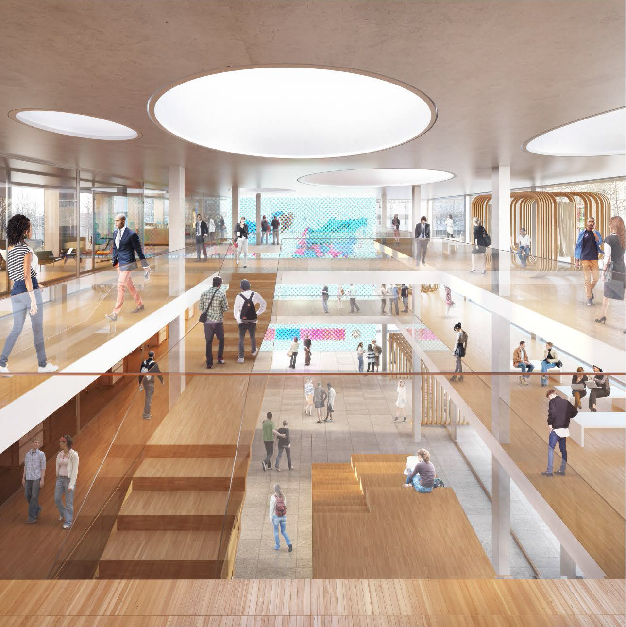 Das Nutzungskonzept ist durch eine klare vertikale Zonierung horizontal miteinander koppelbarer Funktionsbereiche geprägt. Besonderen Stellenwert kommt dabei den Übergangsräumen zu, die differenzierte Nischen für unterschiedliche Kommunikationsmuster anbieten. Das Maß an Flexibilität und Transparenz entspricht den Erwartungen des Nutzers. Die Seminarräume lassen sich zum Freiraum der Plaza auf der Ostseite erweitern, ein Zugang zur Plaza auf der Westseite des Gebäudes sollte ermöglicht werden.