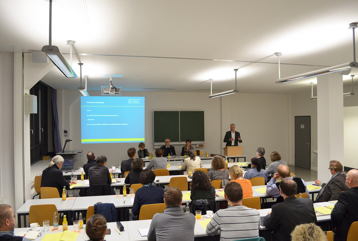 Zum dritten Mal in 2014 kamen die Vertreter der Architektenkammer Thüringen am 24. November in Erfurt zusammen. Der Grund: Zur zweiten Sitzung am 17. Oktober fand die geplante Beitragserhöhung von zehn Prozent mit 21 Ja-Stimmen bei drei Nein-Stimmen zwar die absolute Mehrheit der anwesenden Vertreter, bedurfte jedoch gemäß Paragraph 19 Absatz 5 des Thüringer Architekten- und Ingenieurkammergesetzes der Mehrheit der Stimmen aller Mitglieder der Vertreterversammlung. Zur Bestätigung der vorgeschlagenen Beitragssatzung wären folglich 23 Ja-Stimmen nötig gewesen (wir berichteten).
