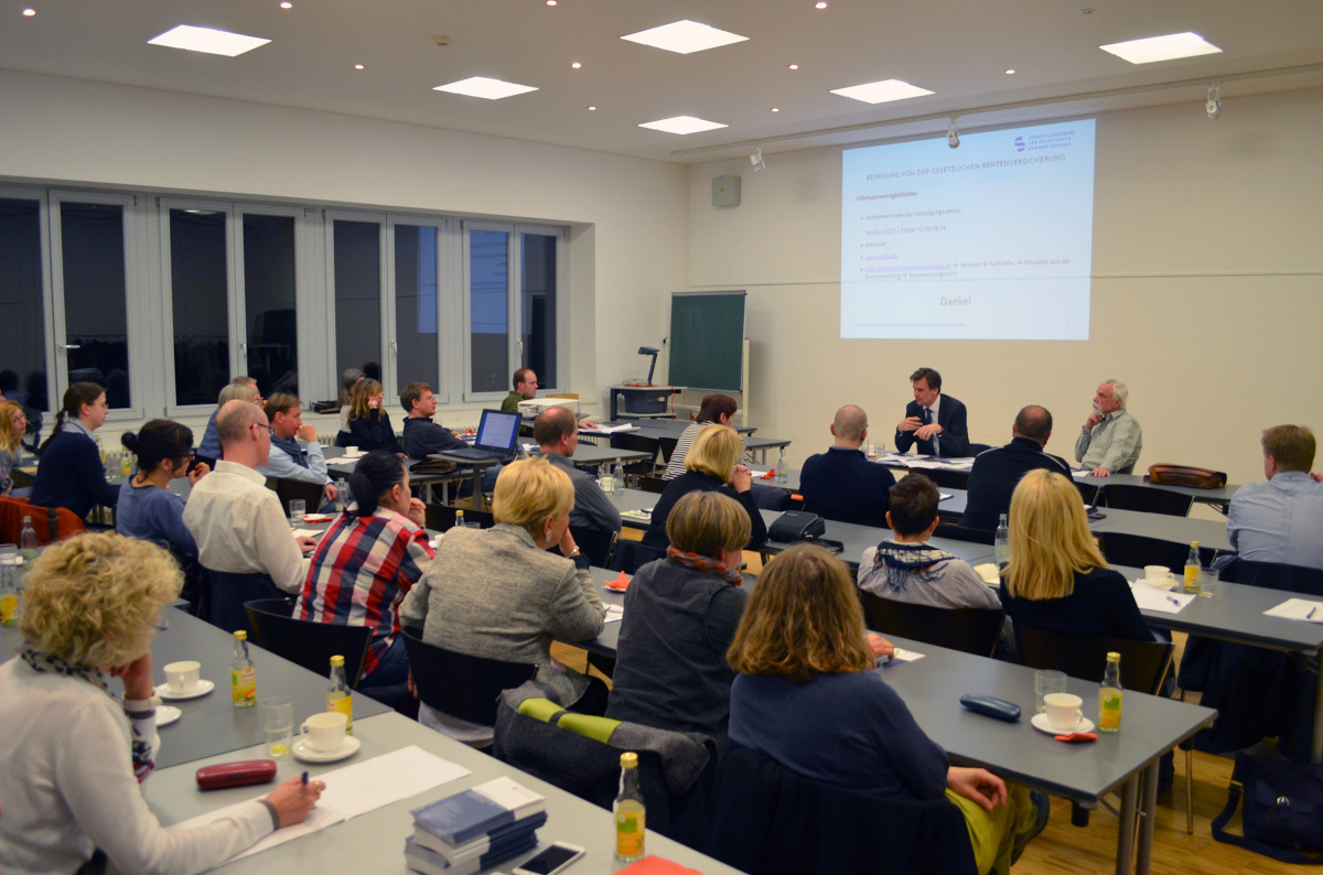 Im Mittelpunkt standen zum einen die anhaltende Niedrigzinsphase an den Kapitalmärkten und ihre Auswirkungen auf das Finanzierungssystem des Versorgungswerks sowie zum anderen die Entscheidungen des Bundessozialgerichts vom 31. Oktober 2012, die zu grundlegenden Neuerungen im Befreiungsverfahren von der gesetzlichen Rentenversicherung führten. Referenten waren Olaf Wallat, Geschäftsführer des Versorgungswerks, und Michael Hardt, Vorstandsmitglied der Architektenkammer Thüringen und Mitglied im Verwaltungsausschuss des Versorgungswerks.