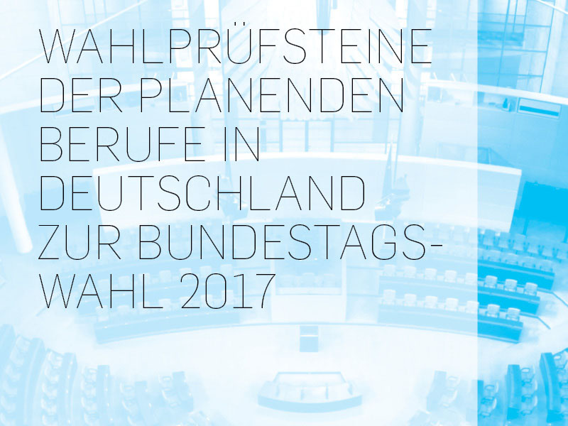 Architekten und Ingenieure schaffen mit ihren Planungsleistungen die Grundlage für die auch international anerkannte hohe Qualität deutscher Bauten und Bauwerke. Zur Sicherstellung dieser Planungsqualität und zur Bewältigung der immensen Bauaufgaben der nächsten Jahre müssen politische Weichenstellungen erfolgen. Dazu legten die Berufsverbände der planenden Berufe den Politikern aller etablierten Parteien im Frühjahr 2017 ihre gemeinsam formulierten Wahlprüfsteine vor.