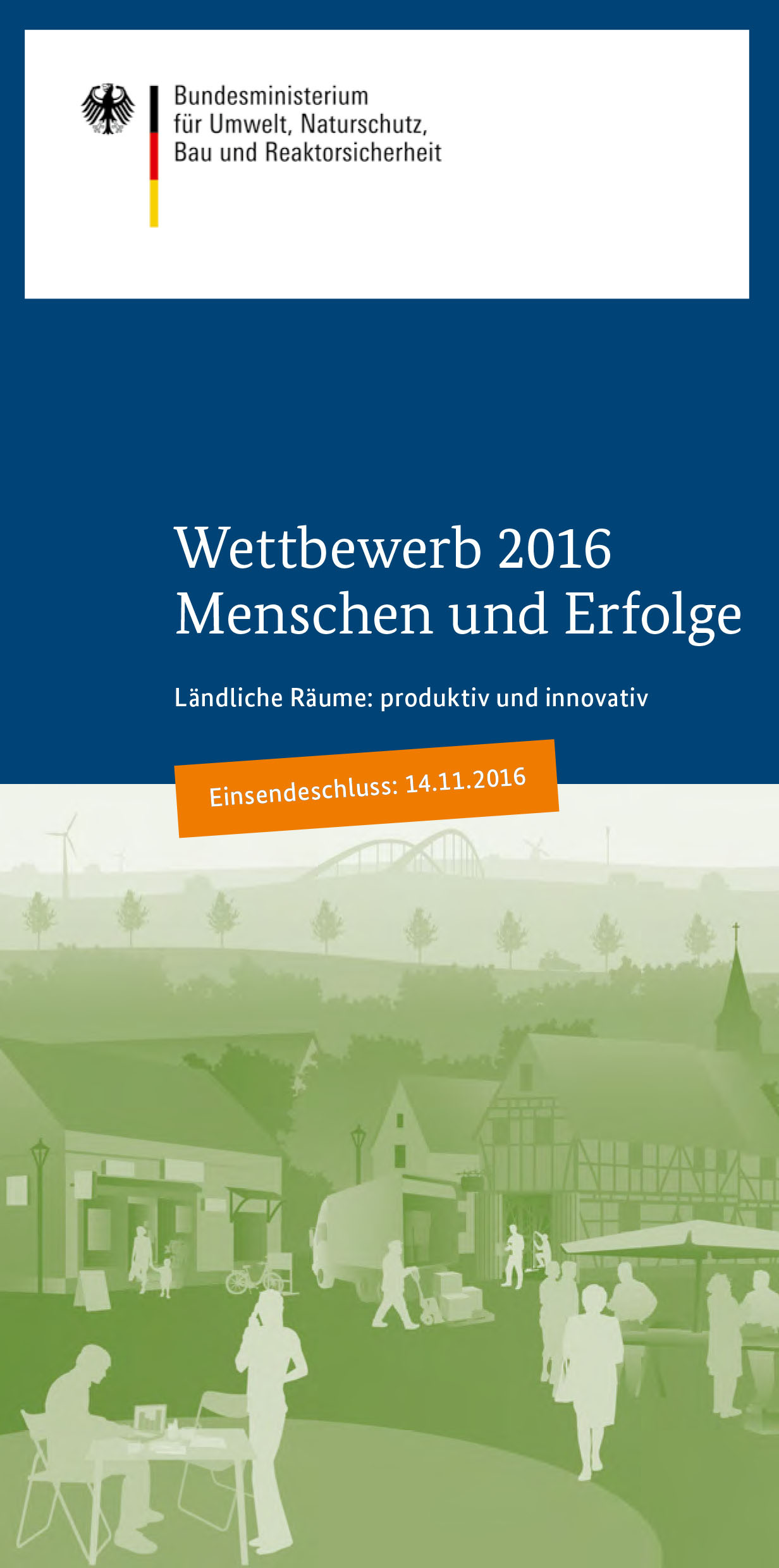 Unter dem Motto "Ländliche Räume: produktiv und innovativ" hat Bundesbauministerin Dr. Barbara Hendricks eine neue Runde im Wettbewerb „Menschen und Erfolge“ ausgelobt: "Damit die Regionen nicht ausbluten, brauchen wir zivilgesellschaftliche Initiativen, Unternehmer, die das enorme Potenzial des ländlichen Raums erkannt haben, sowie Gründerinnen und Gründer, die sich mit neuen Geschäftsideen in ländlichen Räumen niederlassen. Ihr Engagement möchten wir im diesjährigen Wettbewerb "Menschen und Erfolge" würdigen.“