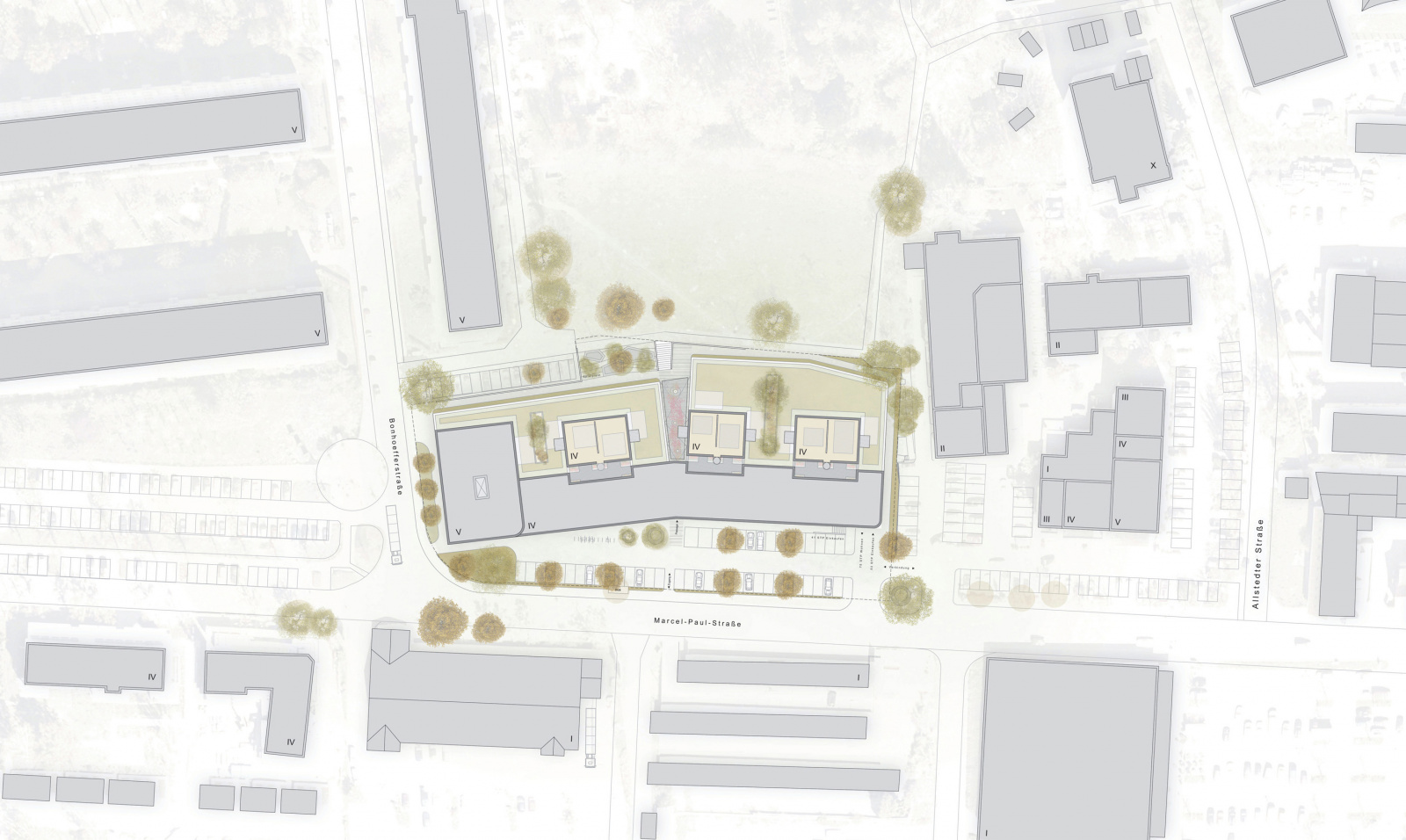 Die Figur schließt den diffusen und überdimensionierten Stadtraum im Süden mit einem Blockrand. Der Arbeit gelingt es die vorhandenen Räume des Wohngebietszentrums aufzugreifen und in einen großen Platz zu überführen. Durch das Zurücktreten des Baukörpers entsteht die geforderte Stellplatzfläche und somit, räumlich geordnet, der Eingang für die Ladeneinheiten und Wohnungen. Mit der städtebaulichen Figur gelingt es dem Verfasser über diesen Platz eine Verknüpfung mit dem Umfeld herzustellen, die das Zentrum Weimar-Nord aufwertet. Die Raumkanten zur Marcel-Paul-Straße und zur Bonhoefferstraße werden klar gefasst. Die dicht nebeneinanderliegenden Zufahrten am östlichen Nachbargrundstück sollten möglichst zusammengelegt werden. Die Ein- und Ausfahrt der Tiefgarage direkt auf den schmalen Gehweg sollte, ggf. durch Verlegung nach Norden, vermieden werden. Im Erdgeschoss sind die gewünschten Handelsflächen schlüssig geordnet. Die auf der durchgehenden Handelsfläche befindliche Wohnschlange wird konsequent erschlossen und somit eine Kollision mit den Handelsflächen vermieden. Die Wohnungen sind sehr schlüssig mit Laubengang entwickelt und kommen mit drei Treppenhäusern aus. Die Fassade ist zurückhaltend gestaltet und folgt in ihrer Systematik der Logik des Wohnens. Zur Straße wird auf auskragende Loggien verzichtet und dadurch eine höhere Nutzbarkeit und zum anderen ein ruhiger, zurückhaltender, nicht aufdringlicher Baukörper erreicht. In der weiteren Bearbeitung lassen sich die Laubengänge zugunsten durchgesteckter Wohnungen verkürzen. (…) Der Baukörper weist durch seine kompakte Form eine hohe Wirtschaftlichkeit bei gleichbleibender hoher architektonischer Qualität auf. (…) Der an der Westseite des Gebäudes liegende nach Norden gerichtete U-förmige Innenhof bietet eine gute Anbindung an die angrenzenden Freiräume.