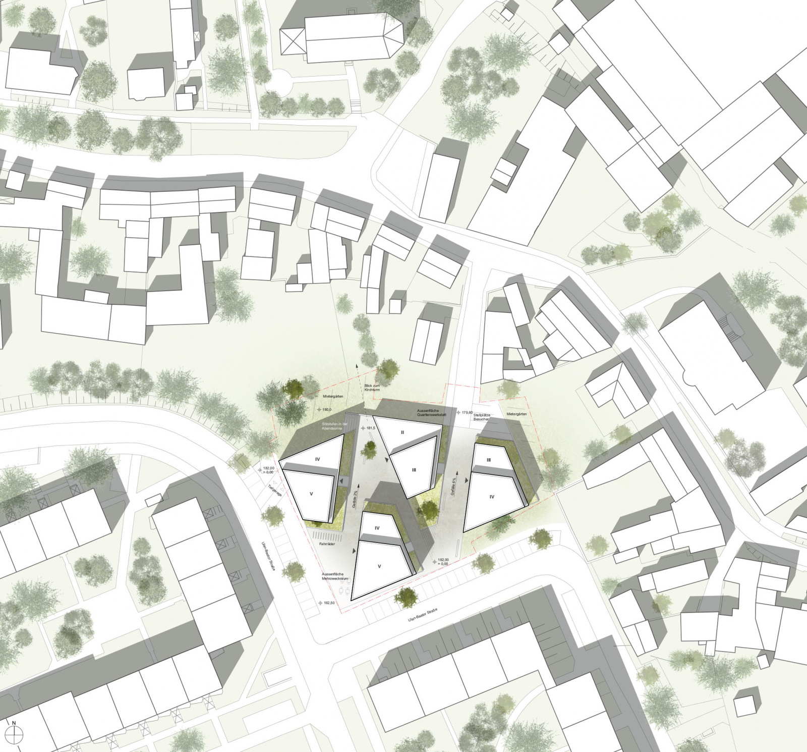 Die Entscheidung des Verfassers für einen „eigenständigen, jedoch vermittelnden Stadtbaustein neuer Prägung“ stellt einen für die Jury nachvollziehbaren städtebaulichen Grundansatz dar. Die Idee mit einer einzigen polygonalen Grundform in unterschiedlicher Ausrichtung und Beziehung zueinander auf dem topographisch sehr anspruchsvollen Grundstück zu arbeiten, erscheint fast simpel, ist jedoch sehr wirkungsvoll. Die unterschiedlichen Winkel der Bausteine nehmen geschickt Beziehung zur umgebenden Bebauung im Schnittpunkt zwischen Plattenbau und historischer Bebauung über eine differenzierte Wegeführung und besondere Blickbeziehungen auf. Die vier einzelnen Bausteine reagieren mit der jeweilig gewählten Geschossigkeit folgerichtig in dem Spannungsfeld zwischen 2 und 5 Geschossen. Die gewählte Typologie von 2- bzw. 3-Spännern mit wiederkehrendem Erschließungskern offerieren mehrseitig orientierte Wohnungen in nahezu vergleichbarer Qualität im Gesamtgebiet und bieten eine „robuste“ Grundstruktur für mögliche Individuallösungen im Vertrieb bzw. Verkauf. In der weiteren Bearbeitung sollten insbesondere die Nutzung und Gestaltung der Freianlagen im direkten Übergang zur Wohnnutzung stärker hinsichtlich der Abgrenzung zwischen privatem und öffentlichem Raum differenziert werden. Die merkliche „Abgrenzung“ zur Dorflage Gispersleben Kiliani wird von der Jury kritisch gesehen, insbesondere die Übergangszone zwischen Stadtbaustein und Dorflage erscheint zu hart und wenig differenziert. Der Maßstabssprung zwischen Haus 4 und der östlich angrenzenden kleinteiligen Bestandsbebauung sollte im Hinblick auf eine deutlichere Abstaffelung geprüft werden. Eine direkte Anbindung von Haus 2 an die Tiefgarage wäre wünschenswert und sollte in der weiteren Planung berücksichtigt werden.