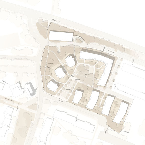 Mit einer ausgewogenen, in sich sehr stimmigen Gesamtfigur gelingt es der Arbeit, die Rahmenkonzeption zu einer schlüssigen Gebäudekomposition weiterzuentwickeln. Die sorgfältige baukörperliche Durcharbeitung, insbesondere der drei Solitärbauten im Baufeld 1 lässt einen räumlich interessanten Beitrag erwarten, der den Charakter des Geschosswohnungsbaus nicht negiert, aber zeitgemäß weiterentwickelt. Die Höhenentwicklung der Solitärbauten sollte dabei zugunsten einer leichten Differenzierung und Staffelung nochmals überprüft werden. Mit unterschiedlichen Gebäudetiefen reagiert der winkelförmige Rücken im Nordosten elegant auf die jeweiligen Belichtungsverhältnisse. Alle Wohngebäude sind auf kurzem Weg von außen her erschlossen, besitzen aber zugleich einen direkten Zugang zur grünen Mitte rund um den erhaltenen Großgrünbestand im Inneren. Diese grüne Mitte ist über den etwas zu groß wirkenden „Kleinen Anger“ sehr schlüssig mit dem Vorbereich an der Gustav-Adolf-Kirche verbunden und bildet damit überzeugend den bislang fehlenden Endpunkt des Kammweges aus. Es wird empfohlen, die Abstände zwischen den Zeilen am Südrand maßvoll zu erhöhen. Die Zonierung der Freiräume ist gut gelöst, besonders hervorgehoben wird die sensible Differenzierung der Vorbereiche zwischen den privaten Hausgärten und den Wegeführungen in Abhängigkeit vom Grad der öffentlichen Nutzung. (…) Sehr überzeugend sind die gut durchgearbeiteten Grundrisse, die nicht nur von der Besonnung sehr attraktive Wohnbedingungen versprechen, sondern auch die jeweilige Aussicht in die freie Landschaft, den Drosselberg oder das Nahumfeld berücksichtigen. (…) Insgesamt eine hervorragende Arbeit, die einen wichtigen Beitrag zur behutsamen Transformation des Stadtteils leisten kann.
