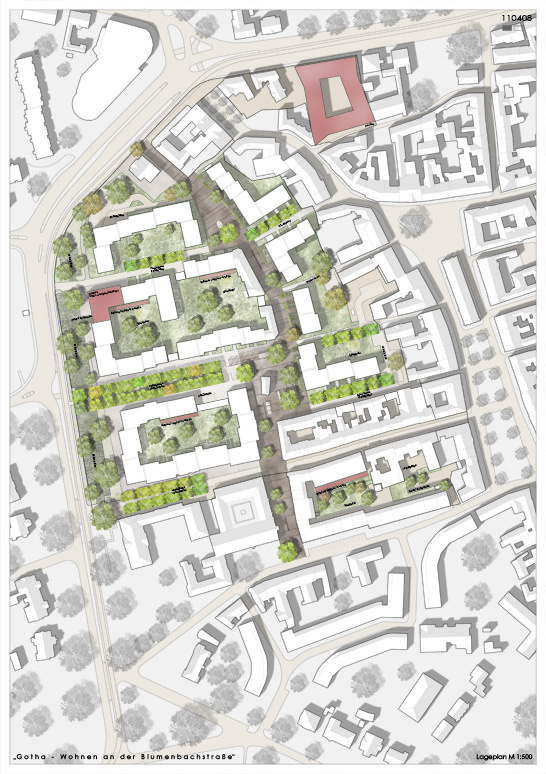 Aufgabe: Das Wettbewerbsgebiet ist Bestandteil der westlichen Altstadt Gothas und grenzt unmittelbar an den historischen und weitgehend sanierten Bestand des Gothaer Hauptmarktes. Es hat eine Fläche von ca. 6,7 ha. Die westliche Altstadt wurde in den 1980er Jahren nach einem Flächenabriss der historischen Bausubstanz überwiegend mit Neubauten in industrieller Plattenbauweise radikal verändert. Dieses Gebiet soll als wichtiger innerstädtischer Wohnungsstandort unter Beachtung der seit 1990 veränderten Rahmenbedingungen und der demographischen Entwicklung zu einem attraktiven Wohn- und Lebensraum entwickelt werden. So ist damit begonnen worden, die Wohngebäude der 1980er Jahre aufzuwerten, die Wohnungen bedarfsgerecht, flexibel und individuell anzupassen und die Freiräume neu zu gestalten.