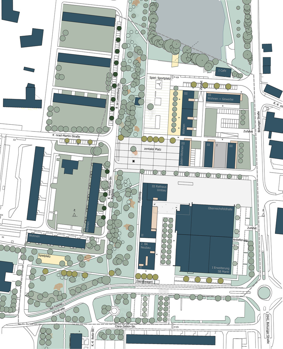 - ein großer Grünraum, der die bestehende Bebauung im Westen begleitet,