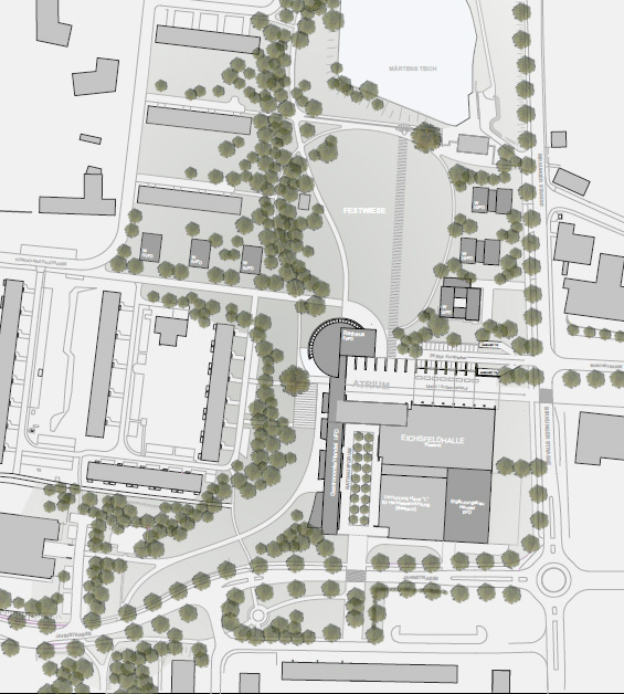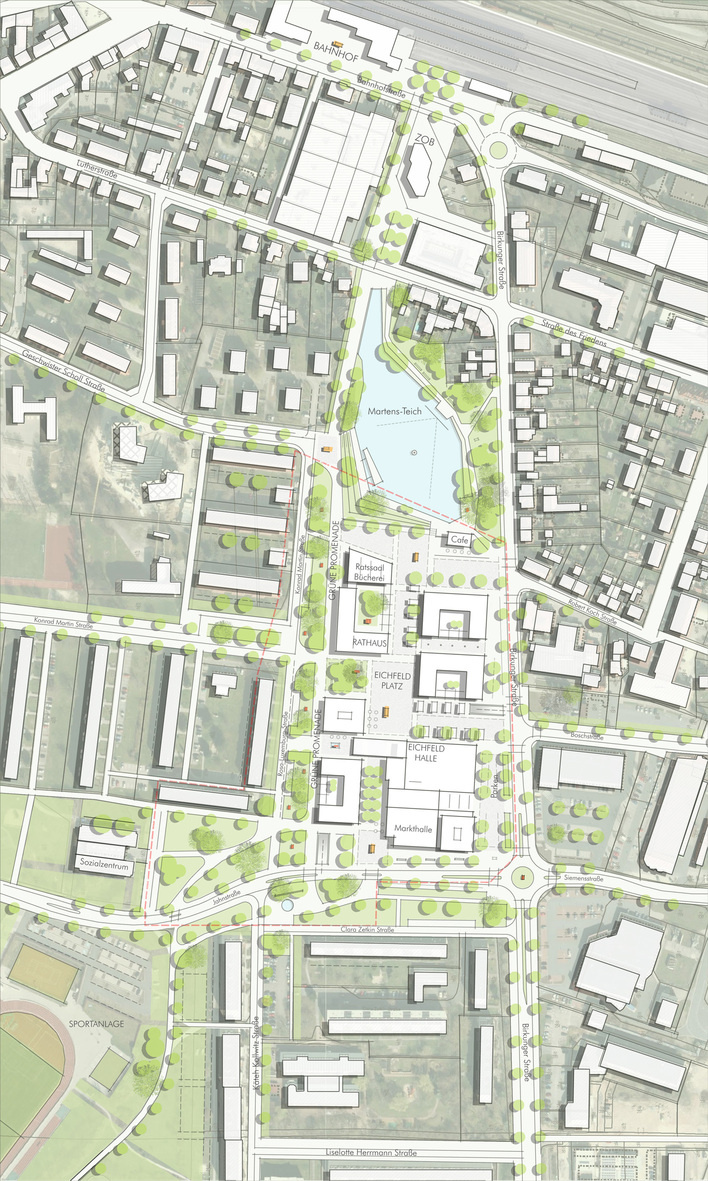 - ein Baufeld im südlichen Bereich mit den öffentlichen Bauten wie Rathaus, Obereichsfeldhalle und SB-Markt,