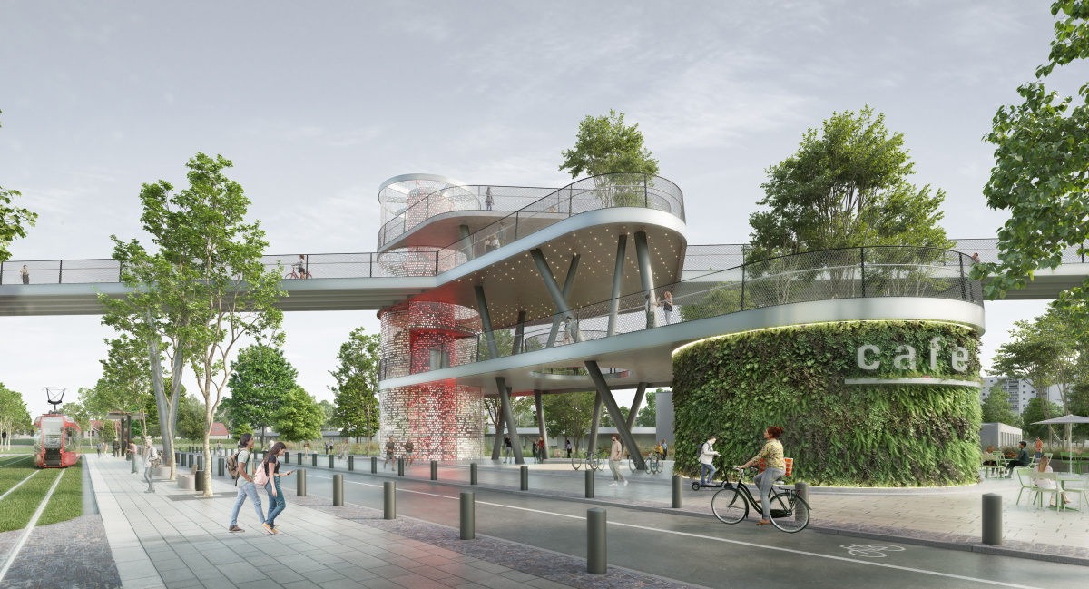 Der Entwurf für die Neue Mitte überzeugt durch viele Elemente. Eyecatcher und zukünftige Verbindung der Siedlungen Herrenberg und Wiesenhügel wird der sogenannte Höhenweg. Er schafft eine sichere und direkte Verbindung für den Rad- und Fußverkehr über das Tal hinweg. An beiden Enden des Weges laden großzügige Stadtbalkone zum Verweilen und Genießen der Aussicht ein. Auch Sitzmauern, Sportgeräte und eine Panoramaschaukel sind hier vorgesehen. Unterhalb der Brücke befindet sich der zukünftige Stadtplatz mit viel Grün. Er wird das Herz der „Neuen Mitte Südost“.