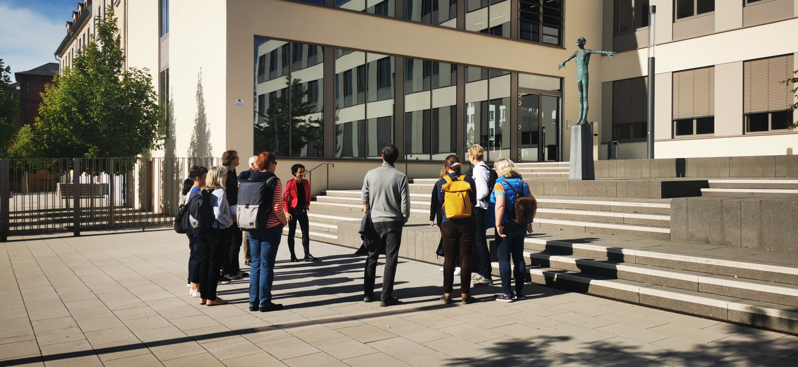 Frau Zobel und Frau Elstermann vom Hochbauamt der Stadt Gera führten die Teilnehmer zunächst rings um den Campus entlang der Reichsstraße hin zum Schulhof, welcher als teilweise öffentlich zugänglicher Bereich treppenförmig das Schulgebäude mit der Straße verbindet.