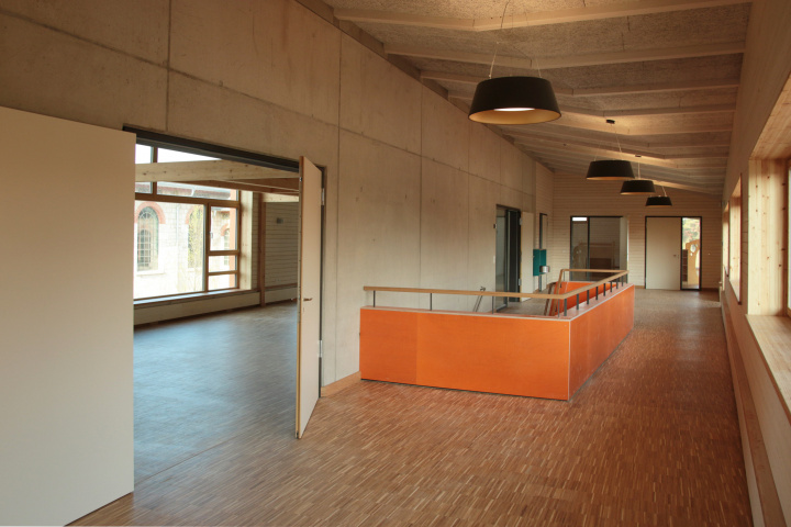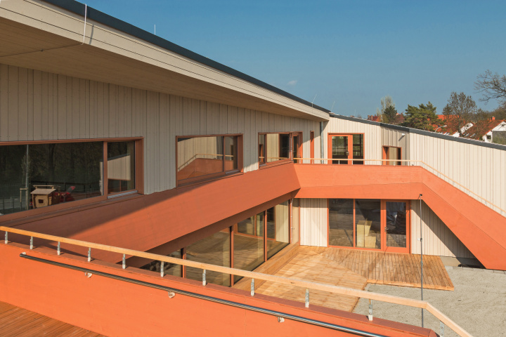 Ein Moderne Plattenbau mit co2 Bindung-Kindergarten für 100 Kinder in Massivholzbauweise.
