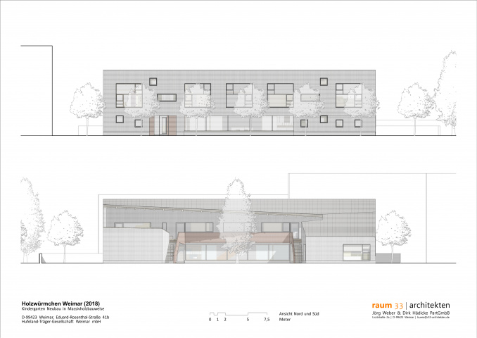 Die Hufeland Träger Gesellschaft Weimar hat das Grundstück erworben um dort ein Kindergarten in massiver Holzbauweise zu errichten. Massive Holzbauweise bedeutet, dass die tragenden Bauteile des Gebäudes zu 100% aus Holz bestehen. Das gewählte System hat einen hohen Vorfertigungsgrad der Bauelemente Wand und Decke und somit eine vergleichsweise Geringe Bauzeit vor Ort. Der Ausbau des Gebäudes wurde vorwiegend mit ökologischen Baustoffen durchgeführt um einen gesunden Ort für die Kinder zu schaffen.
