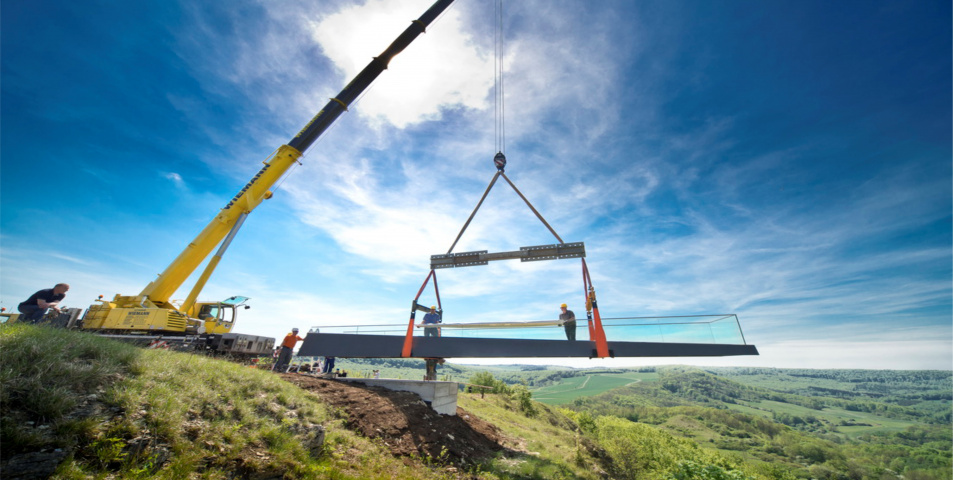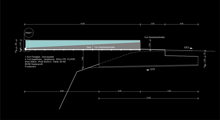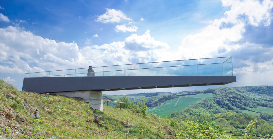 Skywalk Aussichtsplattform Sonnenstein Eins mit der Natur Das 486 Meter hohe Felsplateau des Sonnensteins ist einer der höchsten und besonders markanten Punkte im Eichsfeld. Er bietet einzigartige Ausblicke über den Eichsfelder Landschaftsraum bis hin zum Solling, zum südlichen Harz, zum Kyffhäuser, zu den Göttinger Gleichen, zum Ohmgebirge, zu den Bleicheröder Bergen und zur Goldenen Mark Duderstadt. Dem als Wahrzeichen des Berges bekanntem Stahlkreuz gesellt sich nun der neue Aussichtssteg hinzu. Er schiebt sich mit signifikanter Eleganz, Leichtigkeit und Klarheit in die stille Weite und Freiheit der Landschaft oberhalb der Baumwipfel und Klippen. Hier ist man völlig eins und verbunden mit der Natur. Vom am Bergfuß gelegenen Parkplatz führt ein bewusst schonend angelegter Pfad durch die verschiedenartige Flora des Gebiets. Dabei sensibilisieren Informationstafeln den Besucher für die ökologische Besonderheit dieser Landschaft, insbesondere für die flankierenden, sehr wertvollen Trockenrasengesellschaften. Der neue Aussichtssteg ist 13,4 Tonnen schwer, 14 Meter lang, 2,80 m breit und hat eine 5,2 Zentimeter starken Boden aus Verbundsicherheitsglas. Das massive Betongegengewicht an der Basis des Stegs sichert ihn im Fels. Die elegante Stahl-Glaskonstruktion besticht durch ihre Leichtigkeit und Eleganz. Ihre Formgebung folgt der Momentenlinie der statischen Belastung und entwickelt daraus ein bewusstes Spiel mit den Gefühlen derjenigen, die sie betreten. Der im Querschnitt u-förmig konstruierte Steg ist auf der Plateauseite voll erfahrbar, gibt Halt und Schutz. Je mehr man nach vorn über die Kante der Klippe schreitet, desto weiter sinkt die massive Brüstung ab und wird durch ein transparentes Glasgeländer ersetzt. In dem Maß, wie der massive Teil der Konstruktion nach vorn hin absinkt, entwickelt das transparente Geländer spiegelbildlich seine Höhe. Gleichzeitig löst sich der Boden unter den Füßen nach einigen Schritten sprichwörtlich auf. Man steht als Teil des großen Ganzen, frei mit sich selbst und seinen Gefühlen inmitten der Natur, mehr als 33 Meter über der Klippenkante sowie 100 Meter über dem Talgrund und scheint der Natur dabei noch ein kleines, vielleicht das entscheidende Stück näher gekommen zu sein. Die spezifischen Qualitäten des Glases, das für die begehbare Fläche eingesetzt wurde, mussten ganz besonderen Ansprüchen genügen: Faktoren wie Regen oder das Gewicht der zahlreichen Besucher, die zuvor im freien Gelände unterwegs waren und die Fläche nicht immer mit sauberen Schuhen betreten, wurden berücksichtigt. Hinter der technischen Lösung für den 5,2 Zentimeter starken Glasboden steckt die Firma Saint Gobain Glass. Zum Einsatz kam das begehbare Verbundsicherheitsglas SGG LITE-FLOOR, das ursprünglich für Fußböden und Treppenstufen im Innenraum entwickelt wurde und in diesem Fall aus vier, mit PVB-Folien verbundenen Glasscheiben besteht: Aus zwei Floatglasscheiben, einer teilvorgespannten Schutzglasscheibe und einer weiteren Schicht aus Float Schutzglas. Zusätzlich wurde die Verglasung mit einem siebgedruckten Raster versehen. Neben den rutschhemmenden Eigenschaften dieses Siebdruckrasters – und dadurch einem höheren Gehkomfort auf der Fläche – blieben trotz des zusätzlichen Gewichts auch die Tragkrafteigenschaften des Glases vollumfänglich erhalten. Gleichzeitig erhielt der gesamte Glasboden auf diese Weise einen höheren Bruchschutz. Auf dem Felsplateau ist bereits im vergangenen Jahr zusätzlich ein überdachter Verweilbereich, bestehend aus drei kreisrund angeordneten Sitzblöcken, überspannt von einer geschwungenen zeltartigen Konstruktion aus einem 3 mm Stahlblechtuch, geschaffen worden. Der neue Aussichtssteg und die Figur eines Riesen, der seinen Schuh auskippt, runden nun die neue Attraktivität eines der besonderen Ortes des Eichsfelds ab. Der Sage nach soll der Riese bei seiner Rast hier seinen Schuh ausgeleert und dabei den als Brauner Bühl bekannten Berg auf der gegenüberliegenden Seite kegelförmig aufgeschüttet haben. Steht man auf dem Fundament des Kreuzes, kann man dieses Schauspiel jetzt bildlich nachvollziehen, was aber nicht nur für Kinder ein Highlight ist. Der neue Aussichtssteg auf dem Sonnstein macht die Schönheit und Einzigartigkeit der Landschaft des Eichsfelds in beeindruckender Weise nachhaltig erfahrbar. Er wird künftig mit Sicherheit eine der großen Touristenattraktionen in der Umgebung werden und viele interessierte junge und alte Besucher von nah und fern immer wieder anlocken.